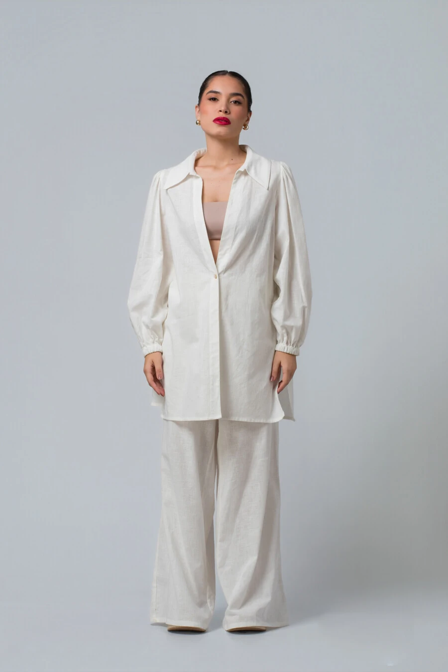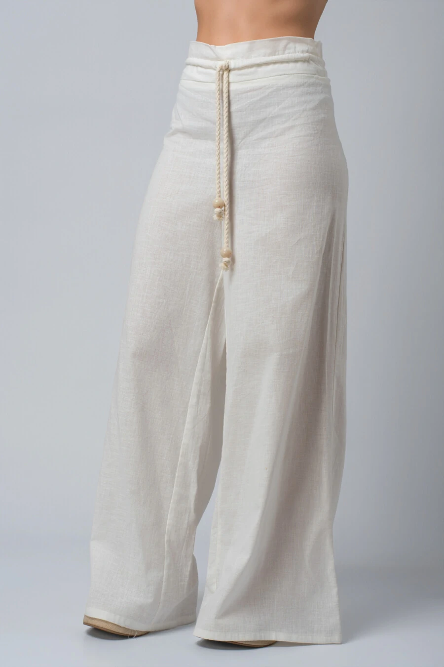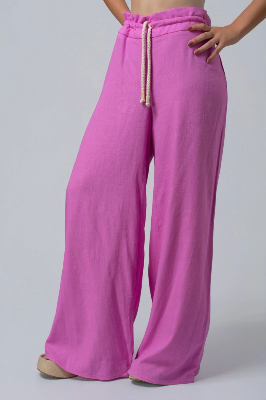 Calça Modelo Pantalona, Cós Alto com Amarração Cordão Ponteira.