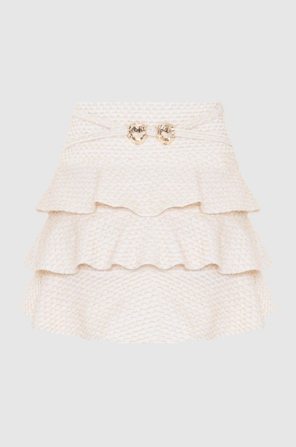 Com um toque jovem e romântico, a saia curta em malha jacquard com lurex combina brilho sutil e movimento fluido em uma silhueta cheia de charme. A pala com aviamento dourado na frente adiciona um detalhe sofisticado ao visual. Os babados em camadas criam um efeito leve e dançante a cada passo, enquanto o zíper lateral garante vestibilidade impecável. Forrada para maior conforto, é a peça perfeita para compor looks festivos e modernos — seja com top coordenado ou mixando texturas para um styling com personalidade.