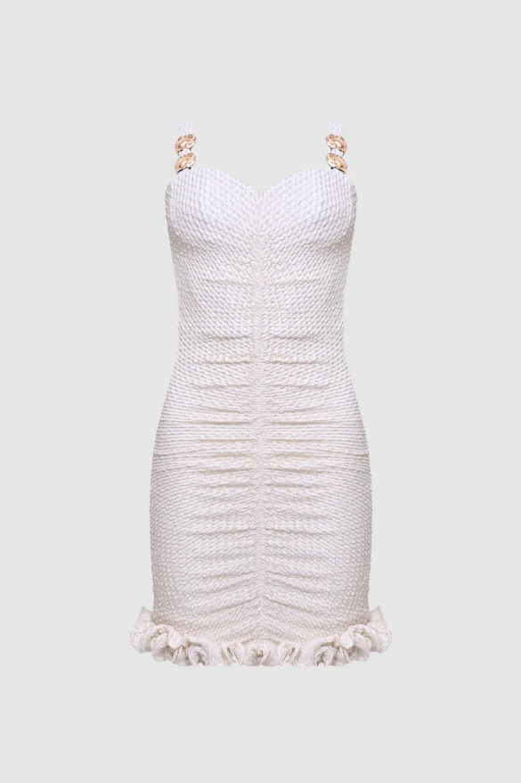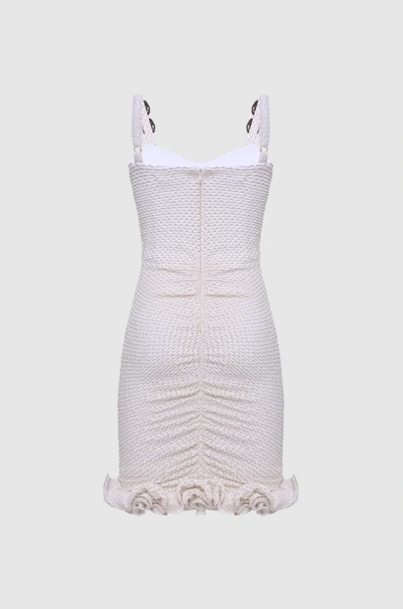 O vestido curto malha gavea é uma verdadeira declaração de sofisticação com um toque de irreverência. Confeccionado em um tecido de malha texturizada com lurex, envolve o corpo com drapeados sutis que valorizam a silhueta. O detalhe em metal dourado nas alças adiciona um toque de brilho e elegância, enquanto a barra volumosa com babados traz movimento e uma dose de ousadia na medida certa.