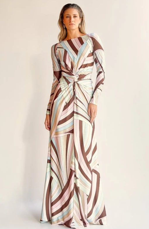 Sofisticado, elegante e cheio de personalidade, este vestido longo estampado traduz o encontro perfeito entre design contemporâneo e feminilidade atemporal. Sua estampa geométrica em tons suaves cria um visual moderno e refinado, enquanto o jogo de linhas alonga a silhueta e confere movimento à peça, resultando em um efeito visual marcante e extremamente elegante.