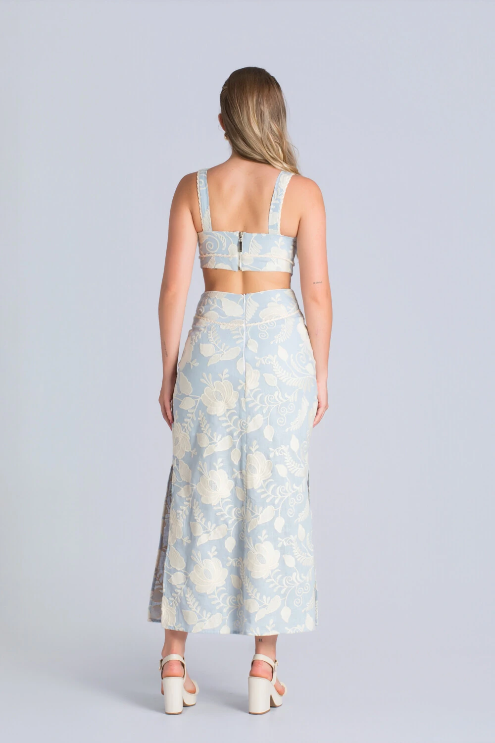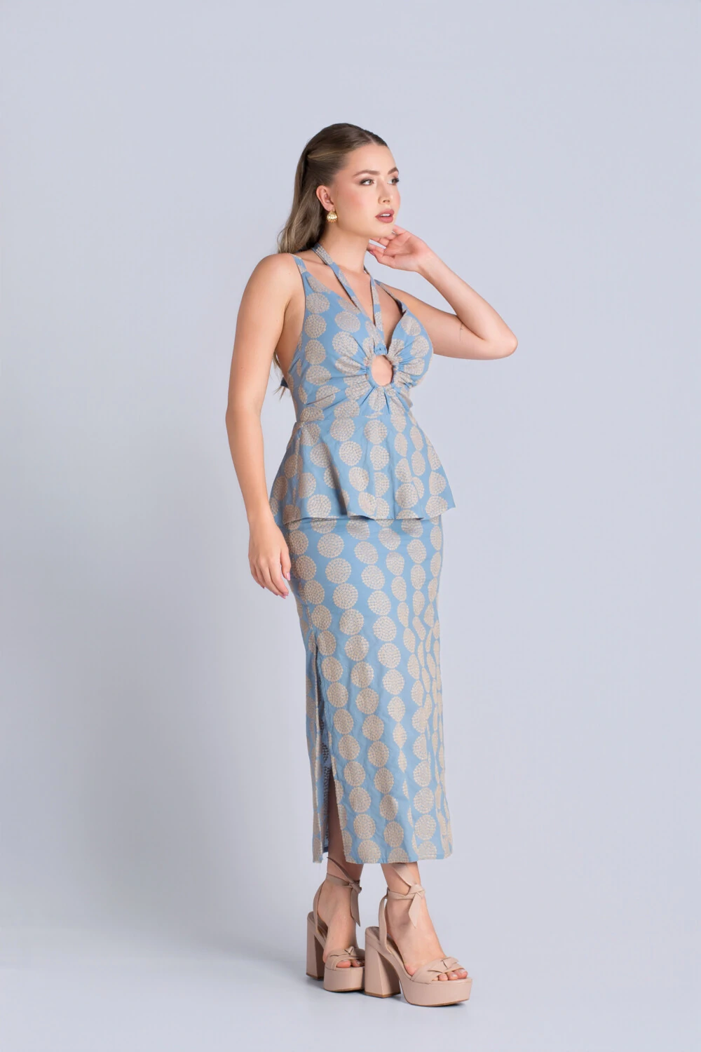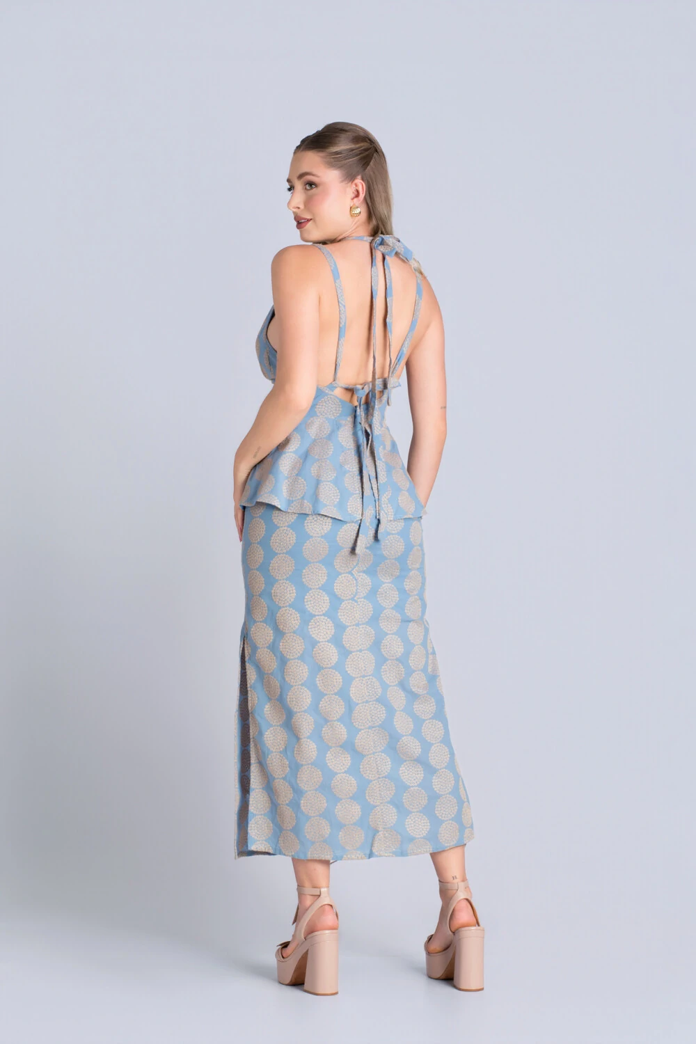 Leve, romântico e ao mesmo tempo marcante, este conjunto em tom azul serenity com bordados florais em contraste traz uma aura de frescor e elegância contemporânea. O top estruturado, com alças largas e recorte sutil na cintura, valoriza o corpo com delicadeza, enquanto a saia midi de modelagem reta alonga a silhueta e garante sofisticação natural.