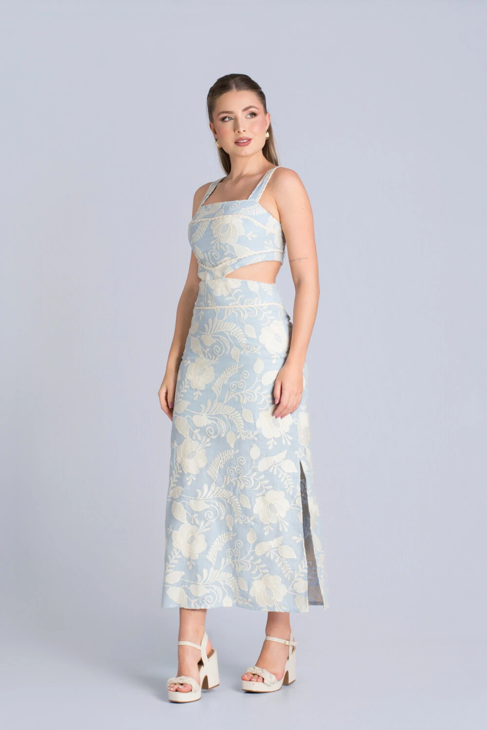 Combine com sandálias neutras e acessórios dourados para um visual chic e atemporal, que reflete charme, frescor e sofisticação em cada detalhe.