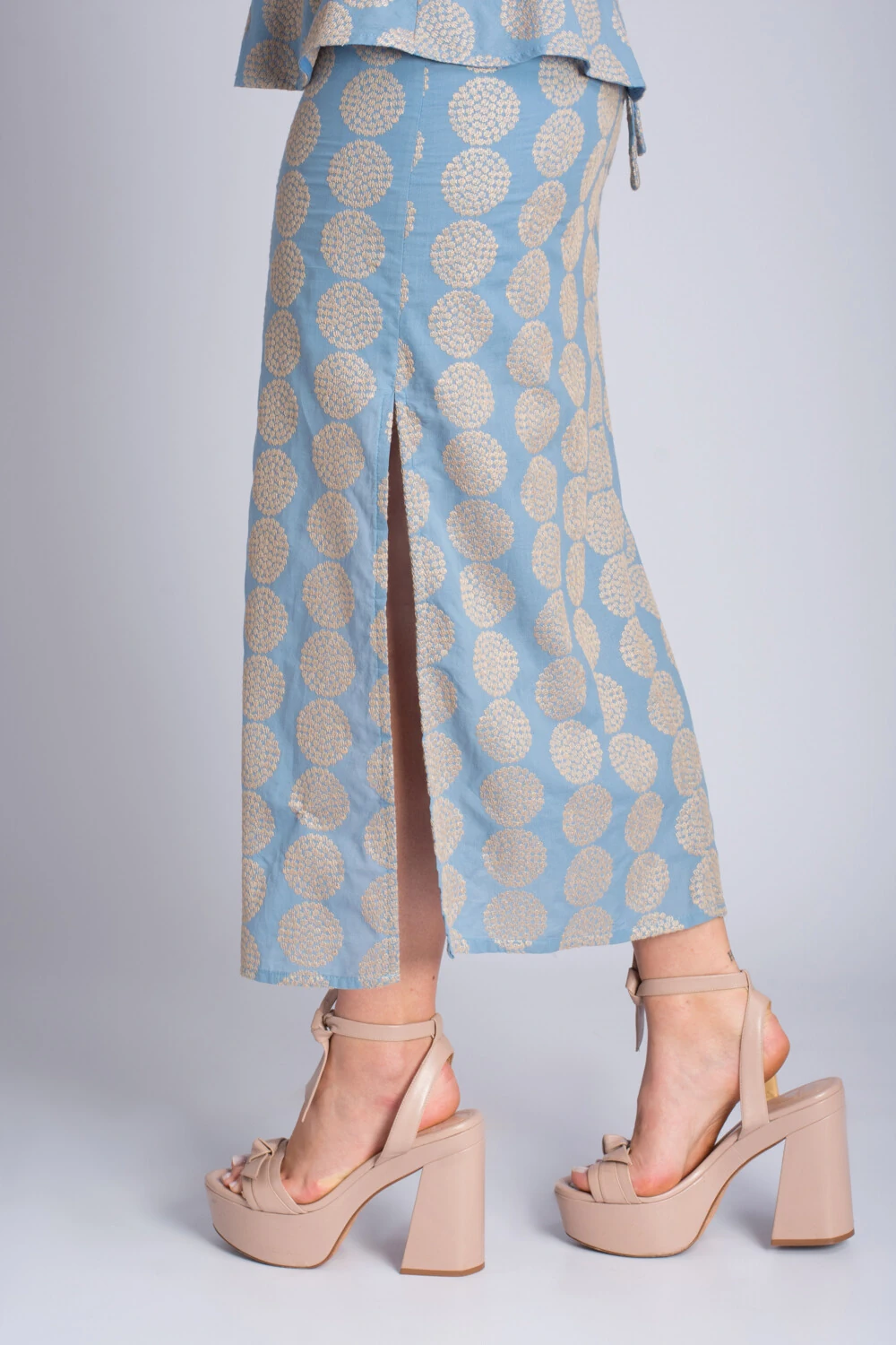 O tecido bordado confere textura e riqueza visual, elevando a peça a um patamar de luxo artesanal. A composição entre o azul suave e o off-white dos bordados traduz feminilidade e leveza, tornando o conjunto ideal para ocasiões diurnas elegantes, eventos ao ar livre ou encontros especiais.