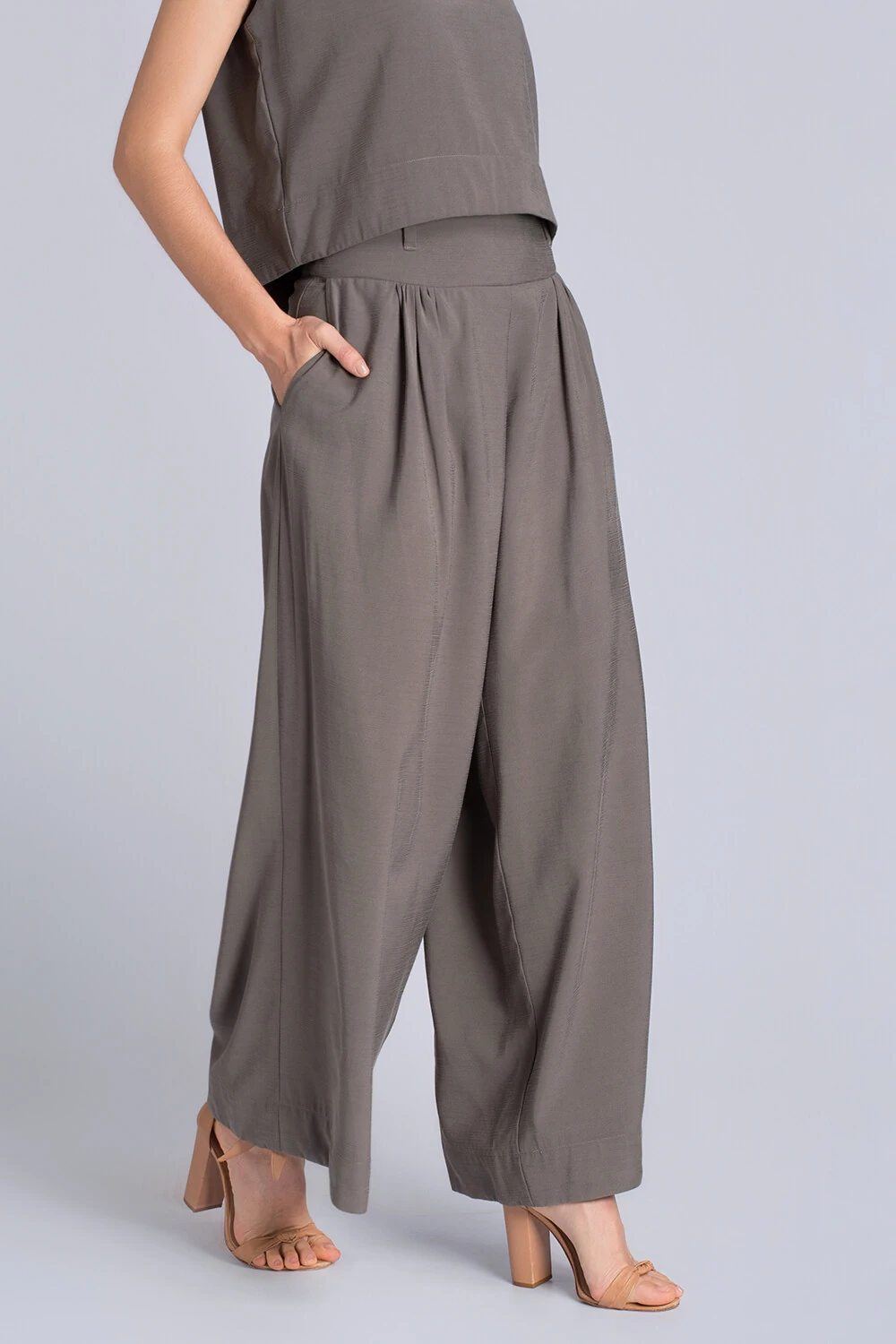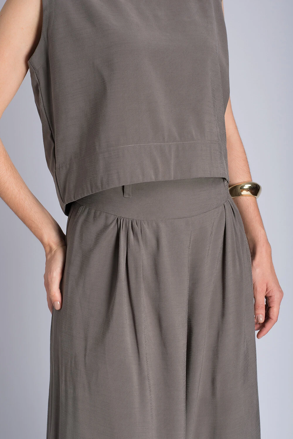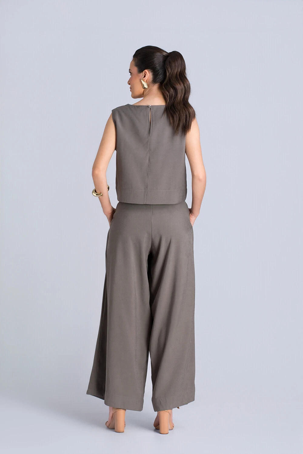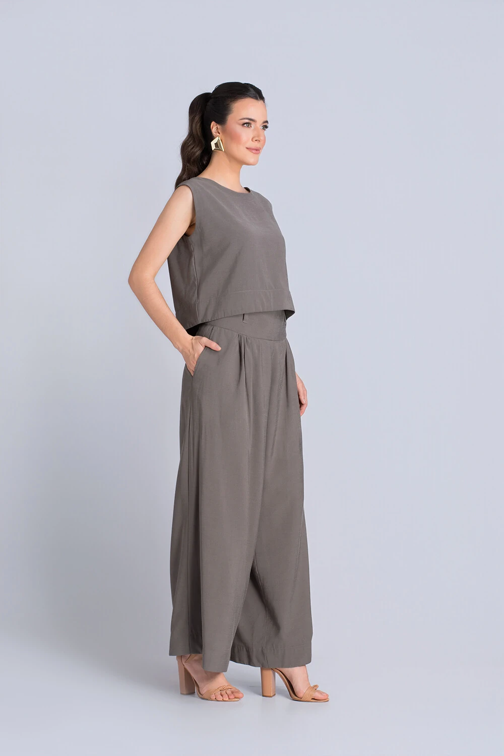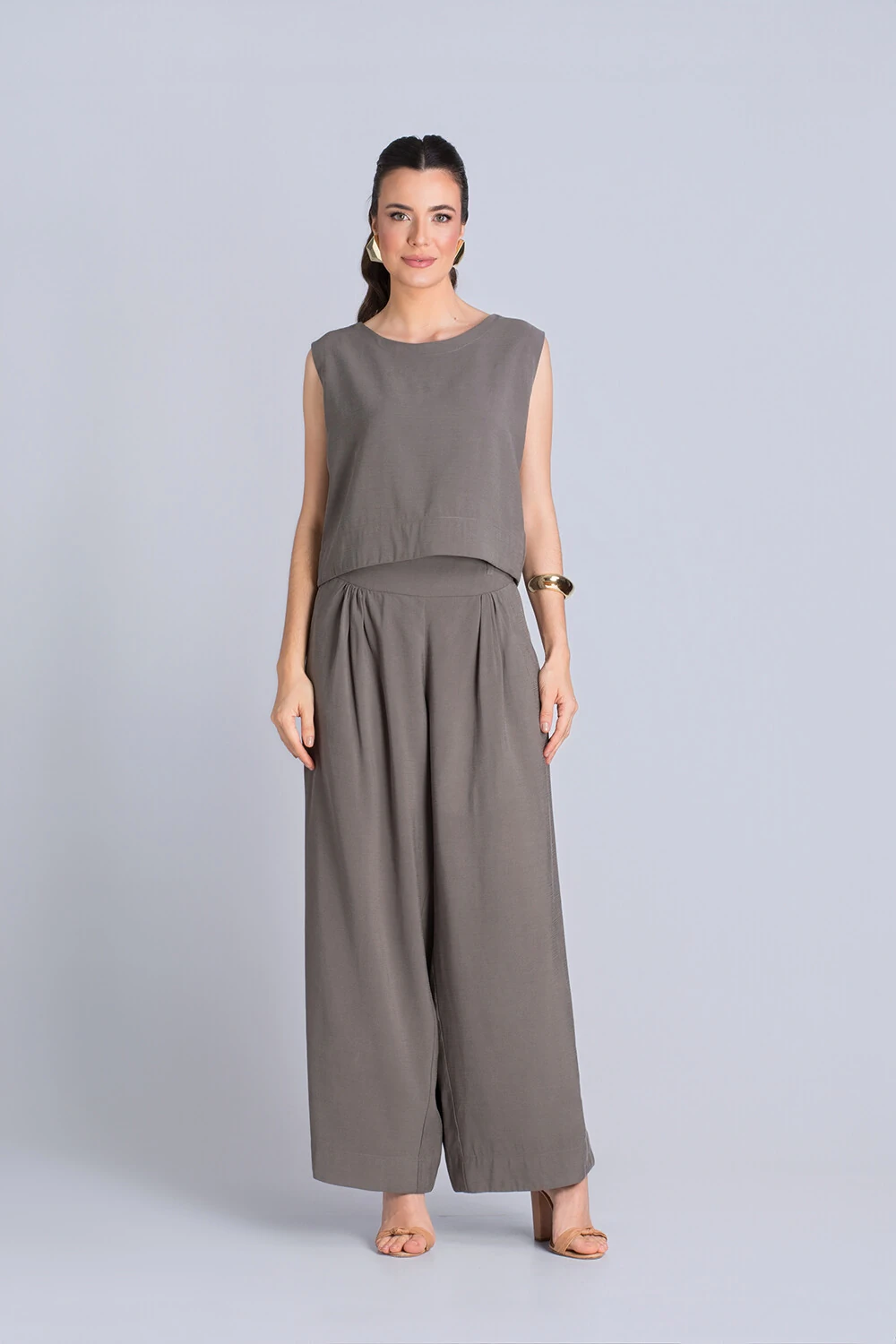 O top de corte reto e sem mangas traduz o estilo clean e moderno, ideal para composições que privilegiam linhas puras e um visual leve. Já a calça pantalona de cintura alta, com pregas sutis e caimento fluido, alonga a silhueta e traz movimento natural a cada passo.