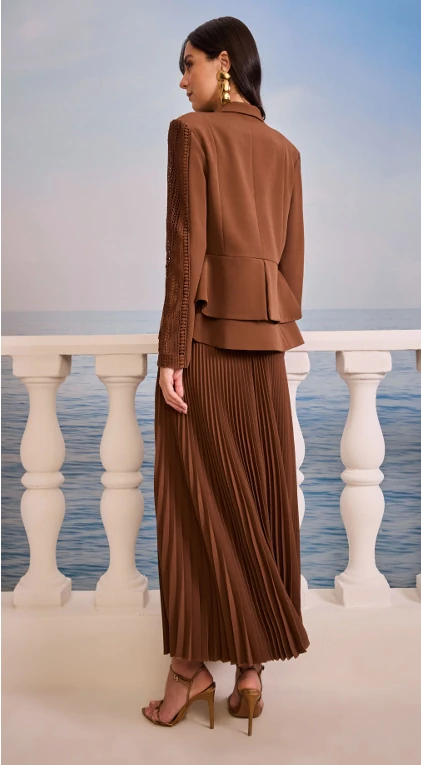 A saia plissada marrom da collab Forum + Tufi Duek é um ícone de feminilidade sofisticada, unindo movimento, elegância e modernidade em uma peça atemporal.