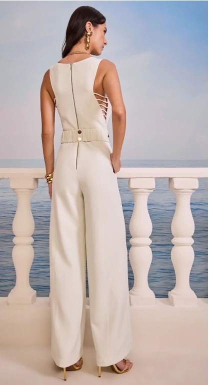 O macacão off-white da collab Forum + Tufi Duek é a escolha perfeita para mulheres que desejam um visual de impacto, sofisticado e elegante. A modelagem une estrutura impecável e caimento fluido, criando um look que valoriza a silhueta sem abrir mão do conforto.