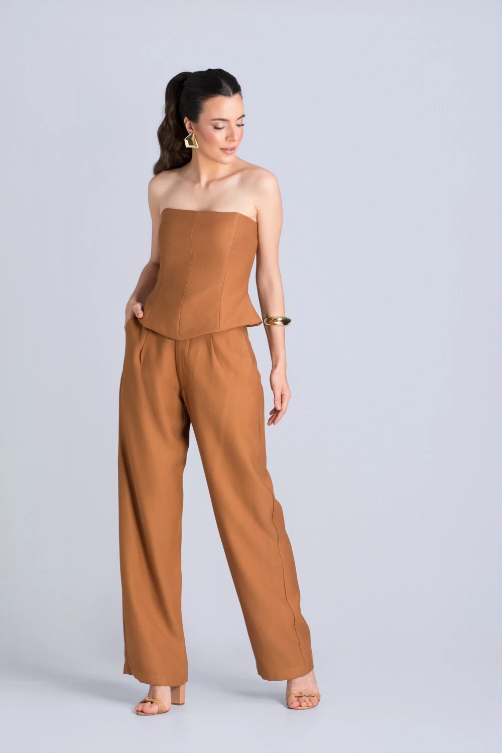 Com modelagem reta e cintura média, ela alonga a silhueta e oferece um ar naturalmente elegante. As pregas frontais e os bolsos laterais adicionam um toque clássico, enquanto o tom caramelo confere modernidade e sofisticação, combinando facilmente com tons neutros, terrosos ou vibrantes.