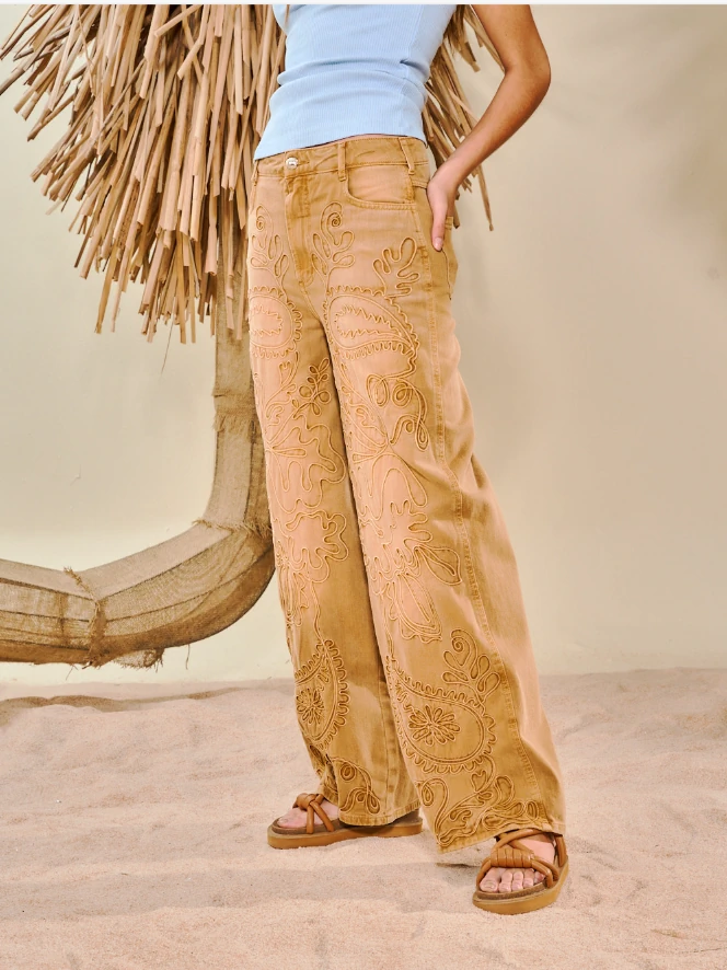 Confeccionada em denim com lavagem caramelo, ela se destaca pela modelagem ampla e fluida, que confere movimento e modernidade ao look. O grande diferencial está nas aplicações bordadas em formato de arabescos e desenhos orgânicos, que adicionam textura, sofisticação artesanal e um toque boho chic à peça.