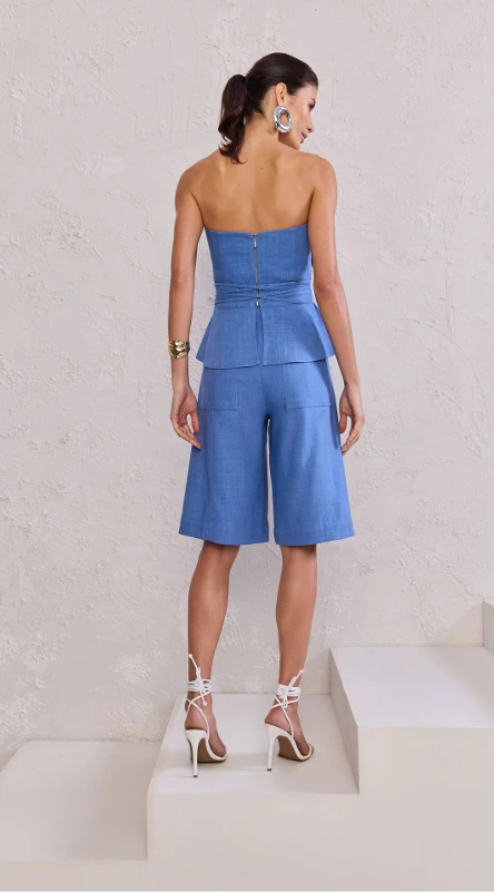 Com design arquitetônico e caimento impecável, esta blusa tomara que caia em alfaiataria é a expressão da elegância contemporânea. O recorte estruturado e sobreposto no busto valoriza o colo com delicadeza, enquanto a amarração fina na cintura destaca a silhueta de forma sutil e refinada.
