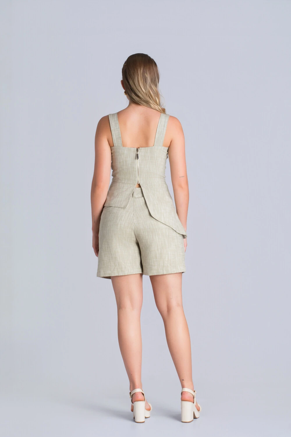 Confeccionado em tecido leve com textura sutil e caimento impecável, ele une o frescor do linho à alfaiataria contemporânea. A modelagem estruturada com alças largas e recorte geométrico no busto valoriza o colo e traz sustentação, enquanto o corte assimétrico na cintura acrescenta modernidade e um toque fashionista ao visual. A parte inferior, em formato de short com pregas delicadas, garante movimento e conforto, mantendo a silhueta alongada e harmoniosa.