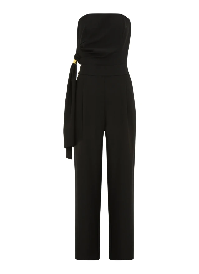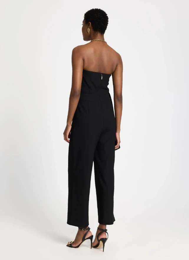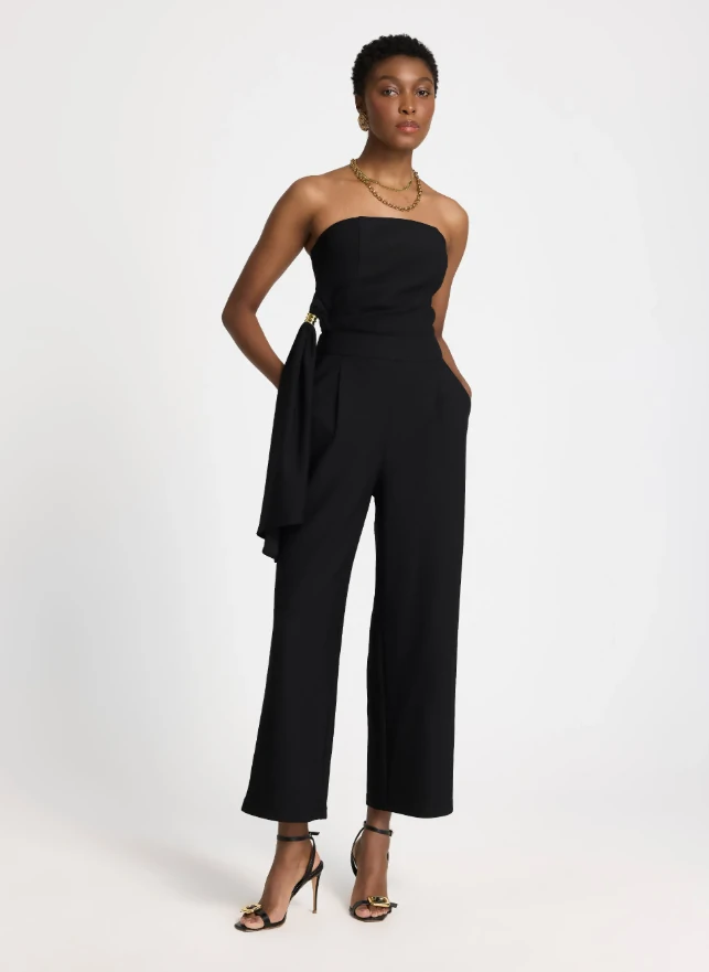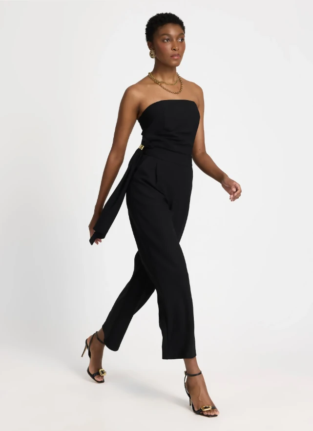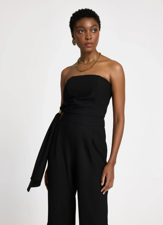 Imponente e sofisticado, o Macacão Raya é a escolha perfeita para produções noturnas que pedem elegância sem esforço, combinando perfeitamente com sandálias de salto e acessórios dourados para um look atemporal e poderoso. Confeccionado em tecido plano com toque leve, o Macacão possui modelagem acinturada, busto tomara que caia estruturado, detalhe lateral drapeado com amarração e fivela metálica dourada, recorte na cintura, pernas de corte reto e comprimento cropped, fechamento posterior por zíper invisível e acabamento interno com forro.