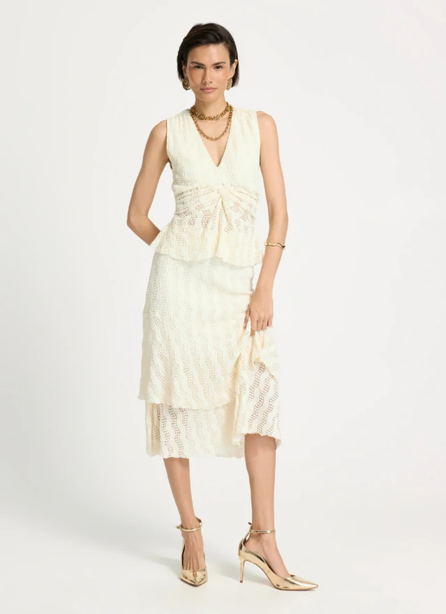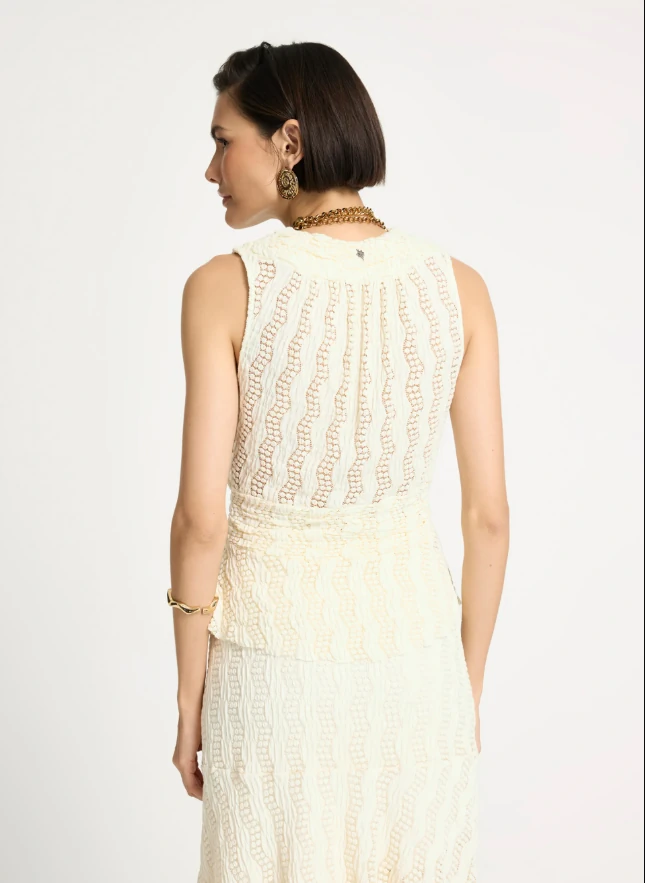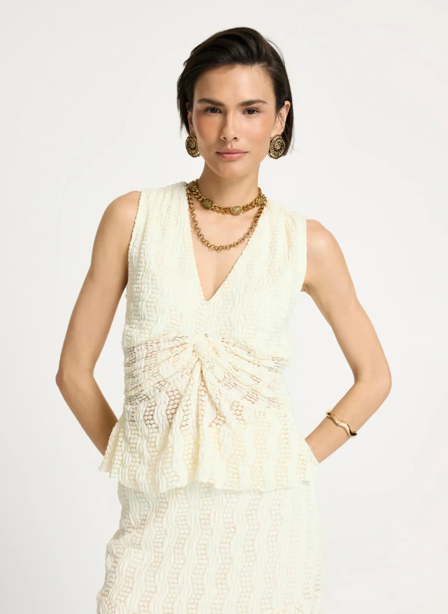 Elegante e sofisticada, a Regata Helena é perfeita para produções harmônicas que transitam entre o mood glam e o contemporâneo, podendo ser combinada com saia coordenada e acessórios metalizados para um visual marcante em ocasiões especiais. Confeccionada em tecido plano, a Regata possui modelagem ajustada, decote V profundo, detalhe drapeado centralizado abaixo do busto, leve efeito texturizado em toda a peça, barra com caimento sutilmente evasê e acabamento refinado.