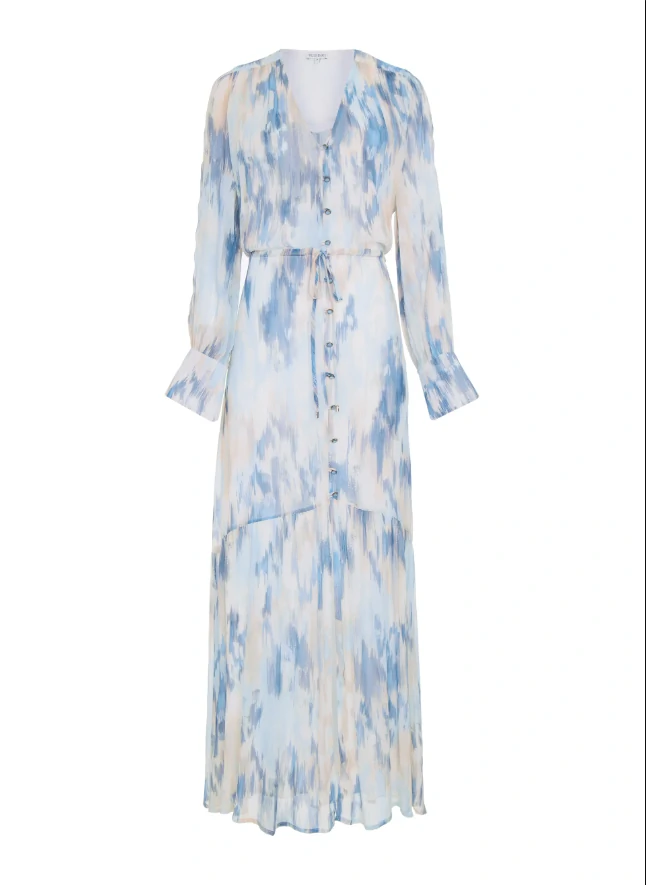 Com mood fresh e sofisticado, o Vestido Dina é a escolha perfeita para produções leves e marcantes, ideal para passeios ao ar livre, viagens à beira•mar ou encontros descontraídos. Combine com sandálias rasteiras, bolsa de palha e acessórios coloridos para um visual harmônico e contemporâneo. Confeccionado em viscose, o Vestido possui modelagem longa com caimento fluido, decote em V, mangas longas com punho levemente aberto em babado, cintura ajustável por cordão com amarração, detalhe frontal com botões que se estendem até a barra, estampa aquarelada em tons de azul e off•white, recortes que valorizam o movimento da peça e acabamento de barra arredondada.