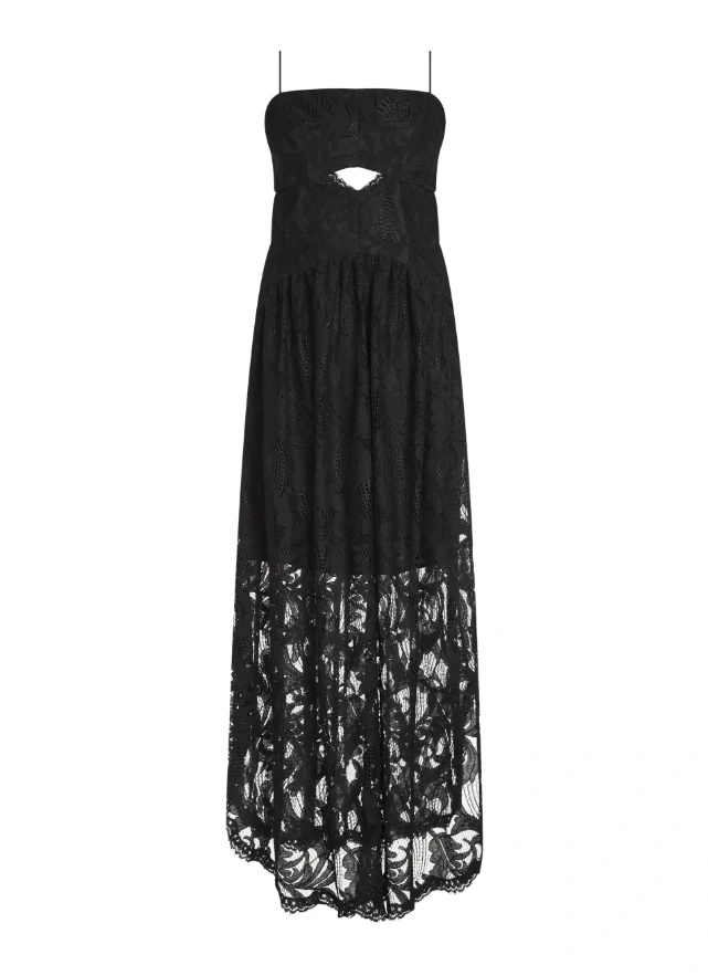 Elegante e sofisticado, o Vestido Rosemary é a peça protagonista para composições noturnas de mood glam, perfeito para ocasiões especiais em que o estilo precisa ser marcante. Combine com sandálias de salto fino e acessórios dourados para realçar ainda mais sua produção refinada. Confeccionado em tecido fluido, o Vestido possui modelagem longa, decote reto, alças finas delicadas, recorte frontal vazado abaixo do busto, saia ampla com transparência parcial em renda floral, barra com acabamento ondulado, fechamento lateral por zíper invisível e forro curto interno.