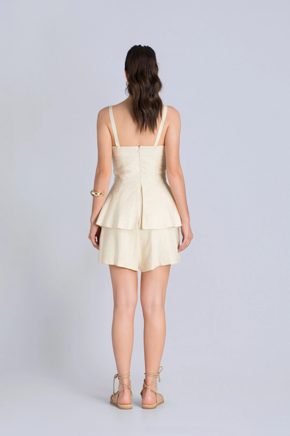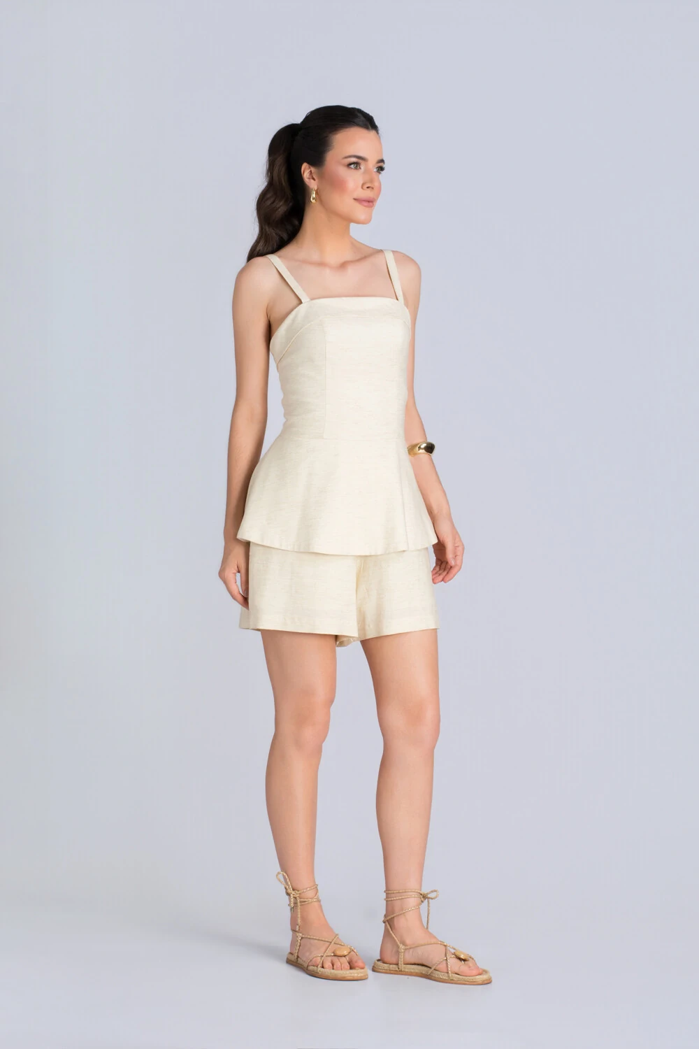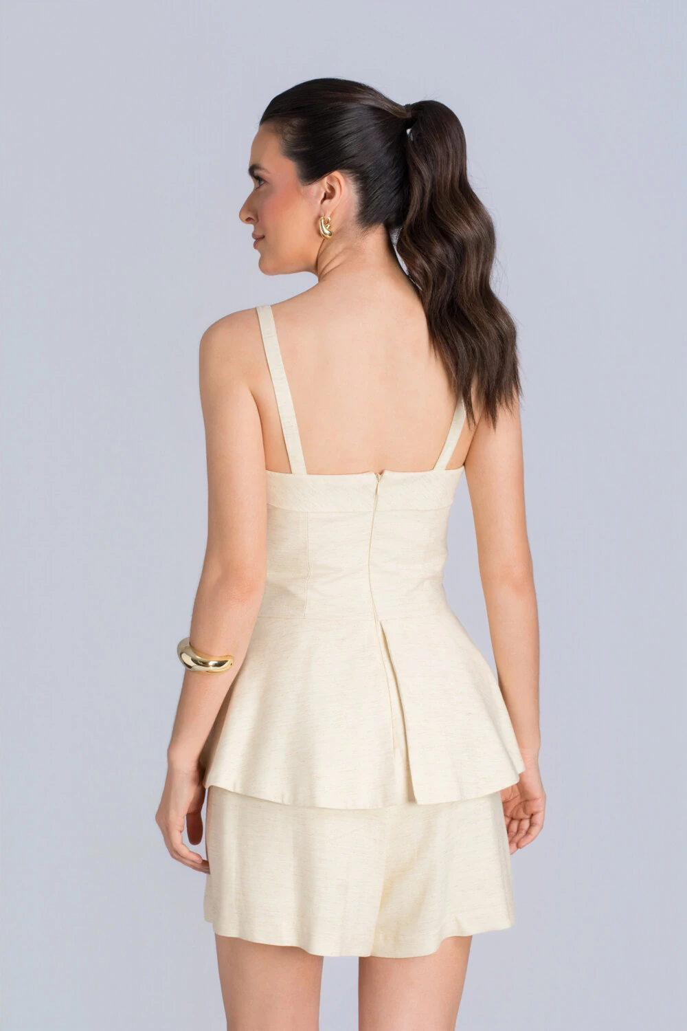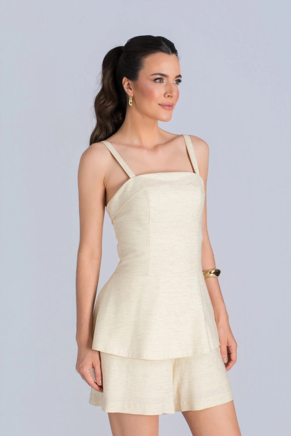 Delicado, leve e cheio de charme, este macaquinho traduz o equilíbrio perfeito entre conforto e elegância minimalista. Confeccionado em linho de tom off white, ele carrega aquela sofisticação natural que transforma o simples em refinado. O recorte ajustado no busto valoriza a silhueta, enquanto a modelagem evasê na parte inferior cria um caimento fluido e feminino, ideal para quem busca um visual moderno e delicado.