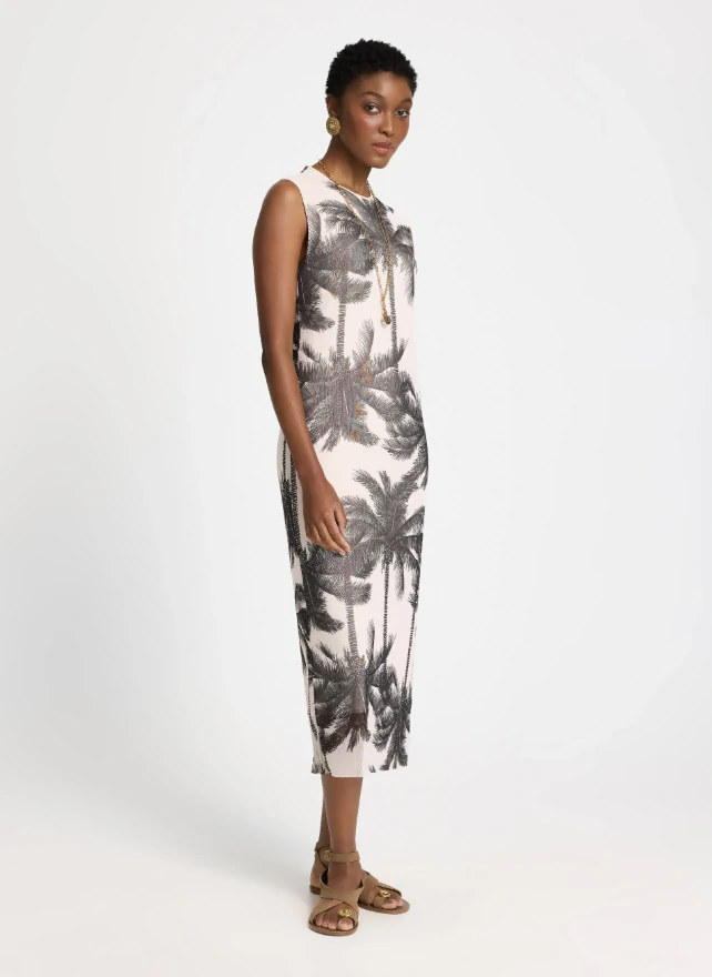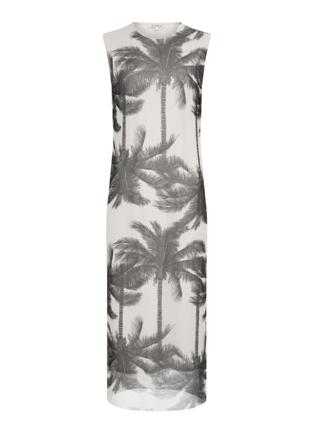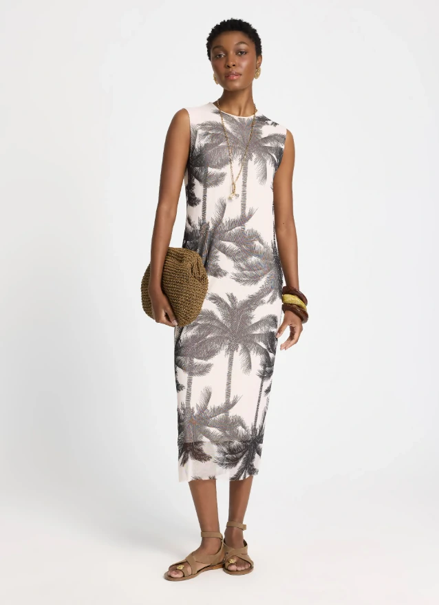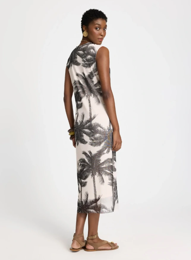 Perfeito para um mood fresh e descontraído, o Vestido Renata é a escolha ideal para produções leves e fáceis de compor, combinando muito bem com sandálias flat e acessórios artesanais, criando um visual autêntico e harmônico para passeios à beira•mar ou encontros diurnos. Confeccionado em tule com elastano, o Vestido possui modelagem reta, comprimento midi, decote redondo, ombros ligeiramente deslocados, estampa de coqueiros em contraste, caimento levemente transparente, fenda lateral discreta e acabamento de barra simples.