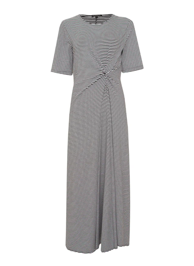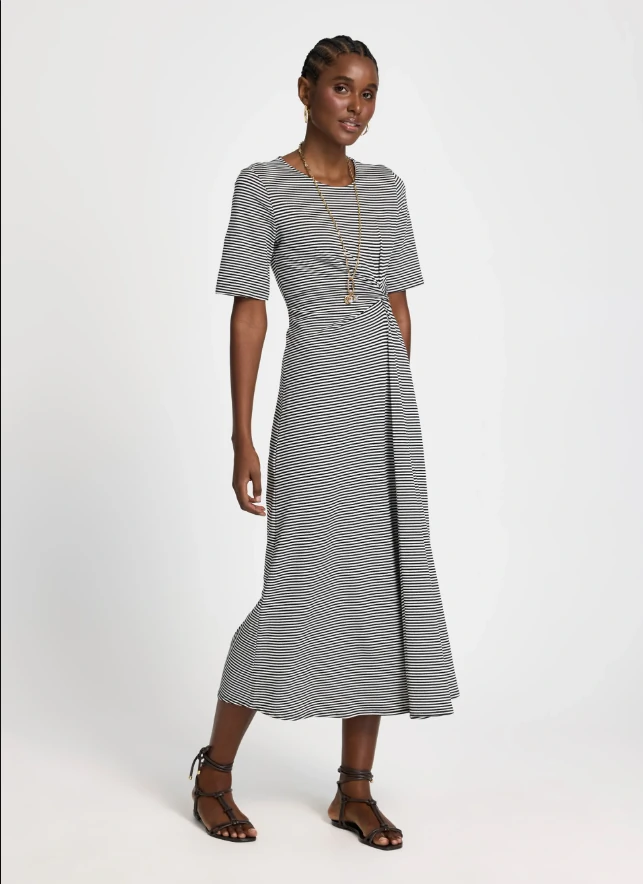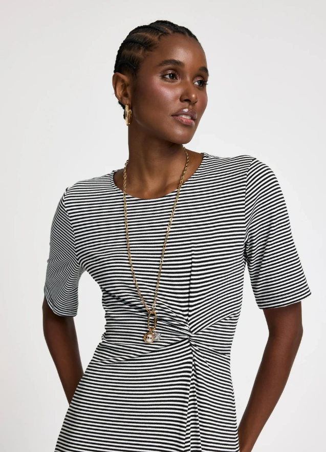 Cool e versátil, o Vestido Kika é a peça que traz leveza imediata ao visual, perfeito para compor produções fresh com sandálias rasteiras no dia a dia ou ganhar sofisticação com acessórios dourados e salto em ocasiões mais elaboradas. Confeccionado em malha, o Vestido possui modelagem midi evasê, decote arredondado, mangas curtas, padronagem listrada em preto e branco, detalhe de torção frontal que forma drapeado vertical no centro da peça, costas lisas sem recortes, fechamento posterior por botão e acabamento pespontado na barra.
