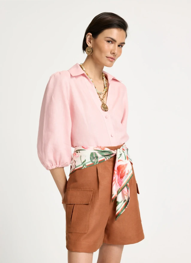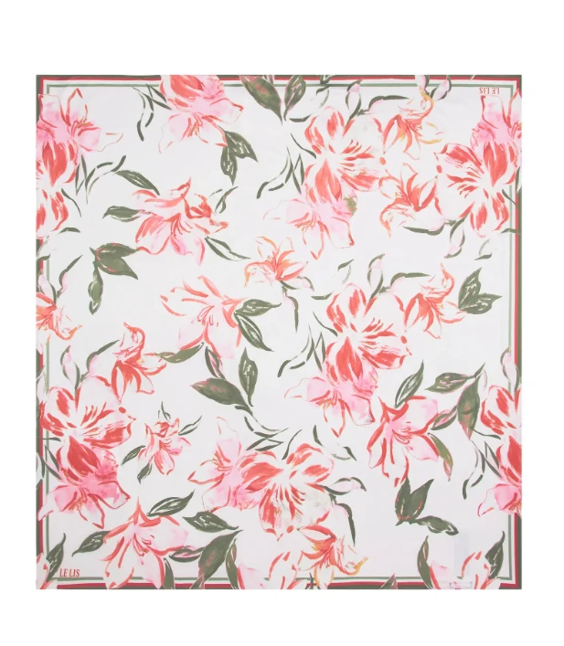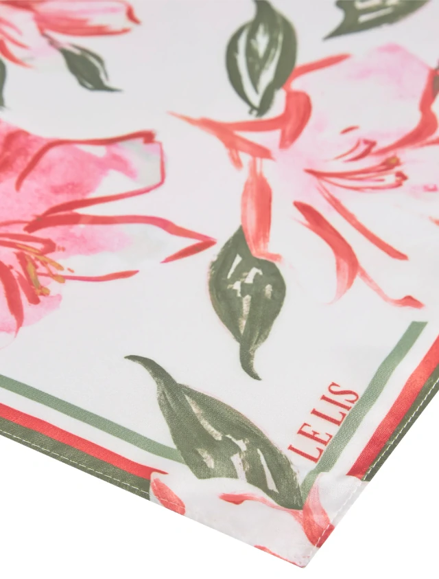 Produzido em tecido sintético, o Lenço possui formato quadrado, estampa com contraste, superfície lisa com caimento leve e acabamento de bordas pespontadas.