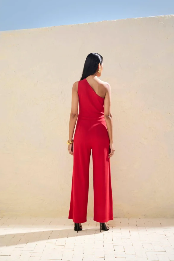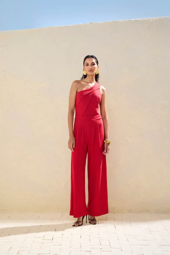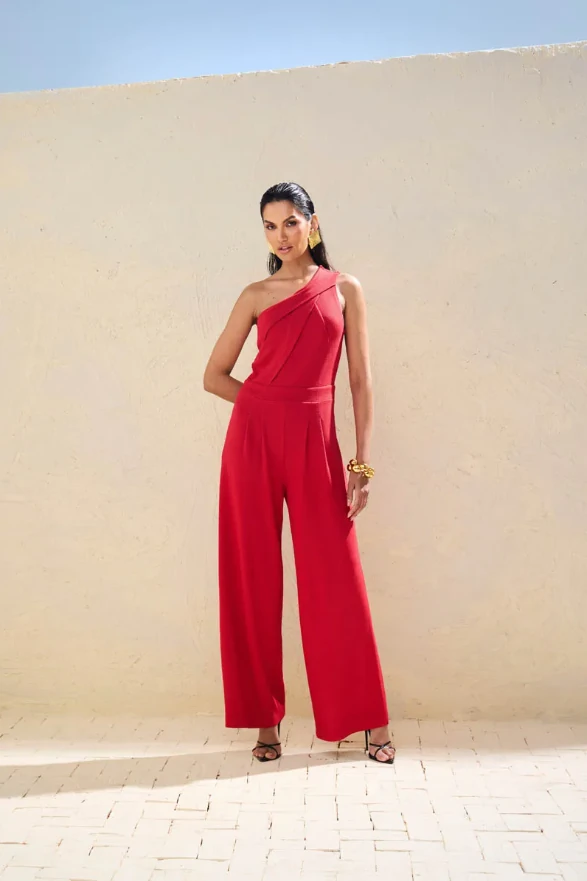 Com design escultural e impecável, este macacão vermelho de um ombro só é a definição de sofisticação moderna. A modelagem fluida, com cintura marcada e calça de pernas amplas, alonga a silhueta e proporciona movimento elegante a cada passo. O decote assimétrico confere um toque de ousadia equilibrado pela alfaiataria precisa, revelando uma mulher confiante e refinada.