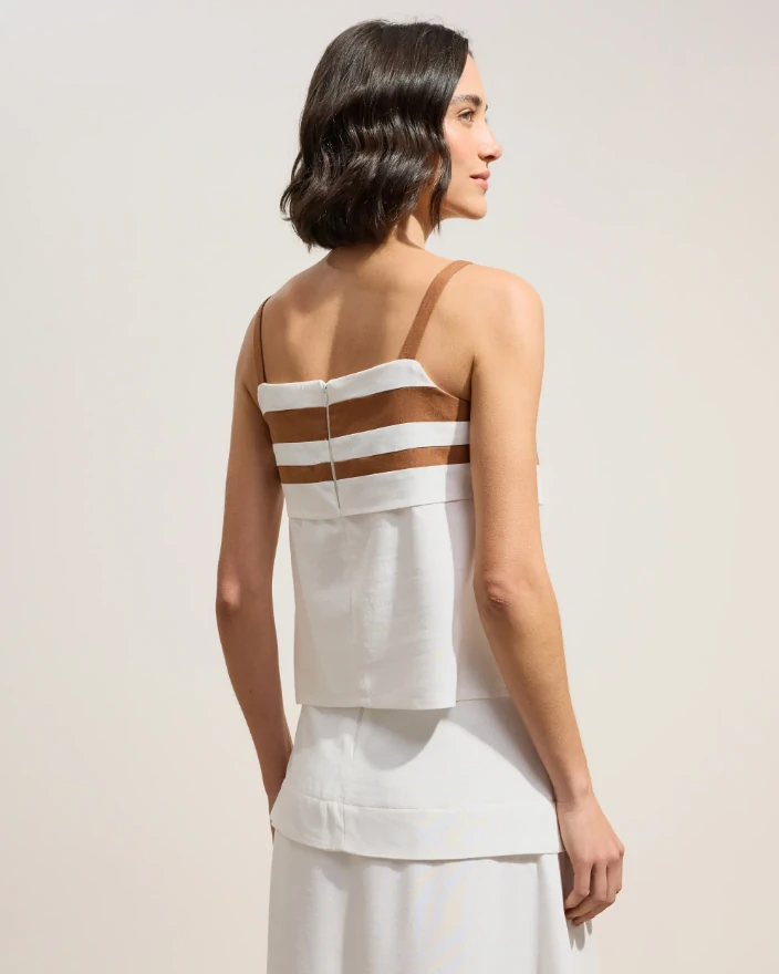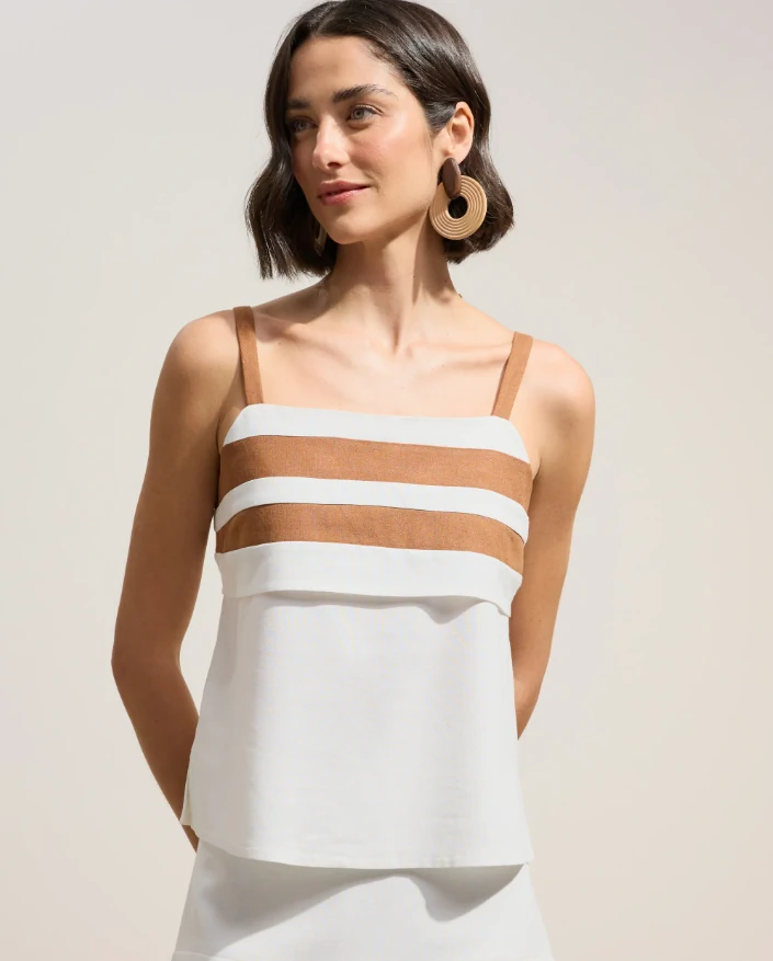 Com uma estética que traduz o luxo simples e contemporâneo, esta blusa combina a leveza do linho com o charme das listras caramelo em um design minimalista e sofisticado. O corte reto e fluido valoriza o movimento do corpo, enquanto as alças finas e o decote reto destacam o colo com sutileza e feminilidade.