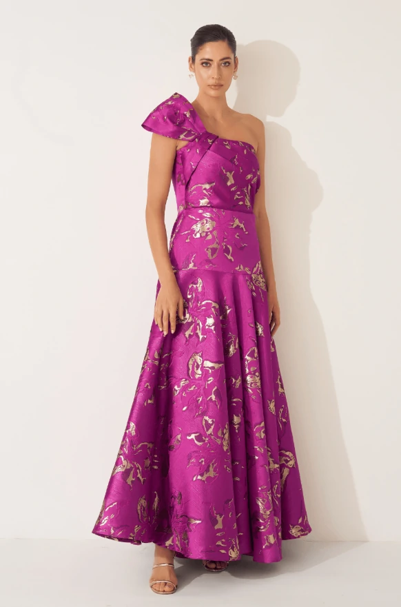 Com presença marcante e riqueza de detalhes, este vestido longo em jacquard floral com fios de lurex traduz o equilíbrio perfeito entre sofisticação clássica e modernidade. A escolha ideal para madrinhas de casamento e convidadas de eventos de gala, a peça se destaca pela imponência do tecido e pela fluidez elegante da modelagem. O jacquard encorpado com textura floral oferece um visual tridimensional, enriquecido por delicados fios de lurex que captam a luz com sutileza e refinamento. O destaque da peça está no decote ombro único, que une charme contemporâneo à tradição dos laços femininos. O laço fixo com detalhe de passante na alça cria uma assimetria moderna e delicada, ideal para quem busca um look com personalidade. As pregas sutis no busto favorecem o caimento da parte superior, trazendo estrutura sem perder a leveza. Já a saia rodada em modelagem ampla adiciona movimento e volume, criando um efeito de impacto visual que acompanha o caminhar com elegância.