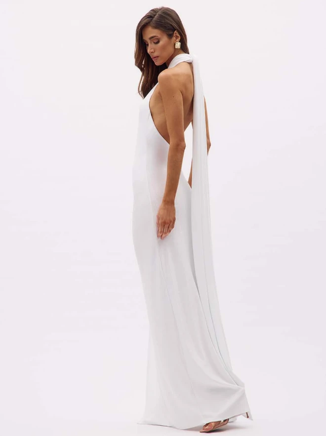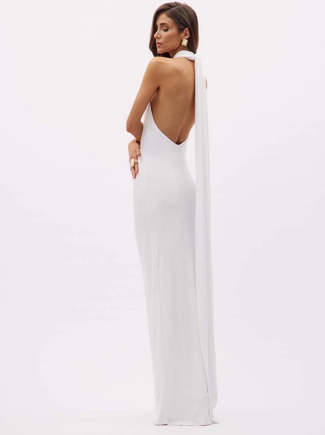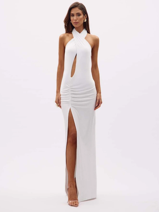 Um vestido criado para impressionar — sofisticado, ousado e impecavelmente refinado. Esta peça longa branca combina fluidez, design arquitetônico e sensualidade minimalista, transformando qualquer ocasião em um momento digno de presença absoluta.
