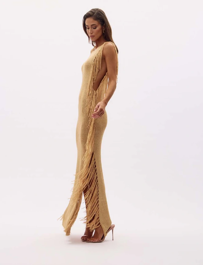 Com textura rica e artesanal, o tricot cria um caimento que valoriza cada curva com naturalidade, enquanto o tom dourado concede um brilho elegante — leve, quente e absolutamente sofisticado. As franjas laterais, longas e fluidas, adicionam movimento a cada passo, criando um efeito visual hipnotizante e cheio de personalidade.