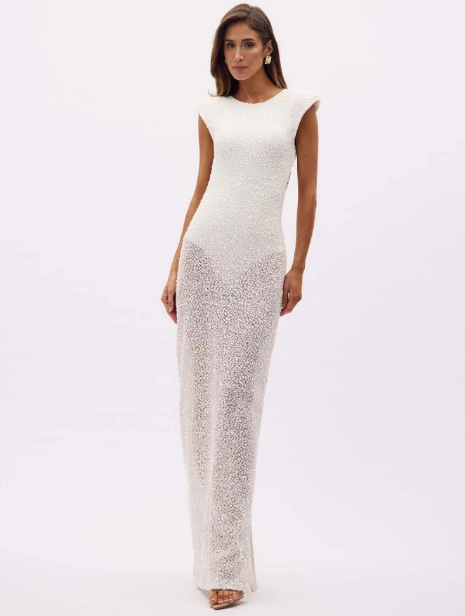 Com um caimento que abraça as curvas com delicadeza, o tecido totalmente texturizado em bordados reluzentes cria um efeito luminoso que transforma cada movimento em destaque. A silhueta segue limpa e alongada, enquanto os ombros estruturados adicionam modernidade à composição, equilibrando feminilidade e força.