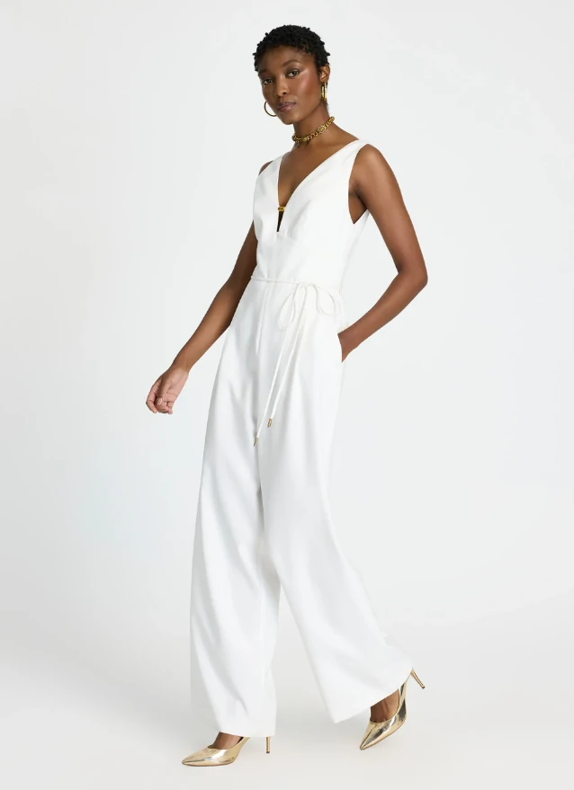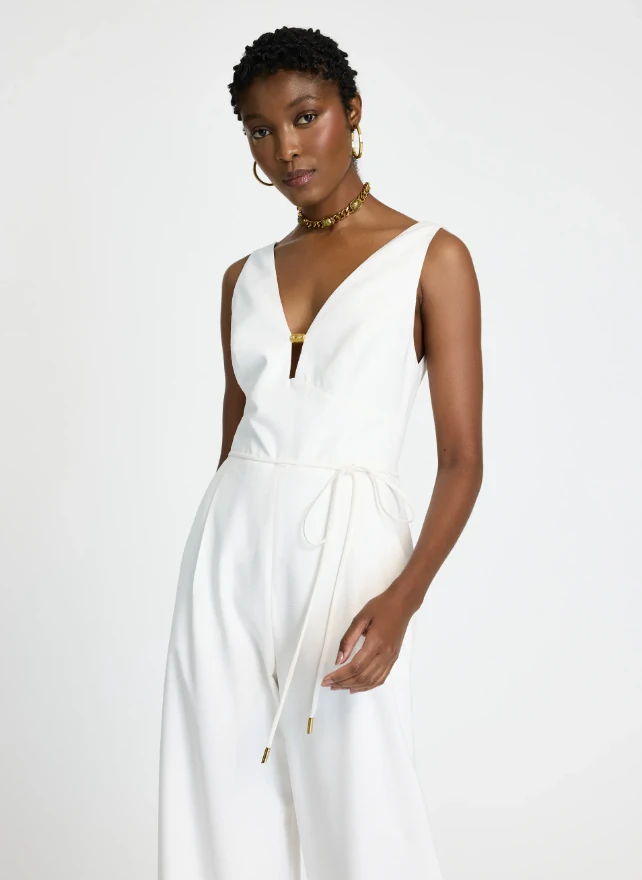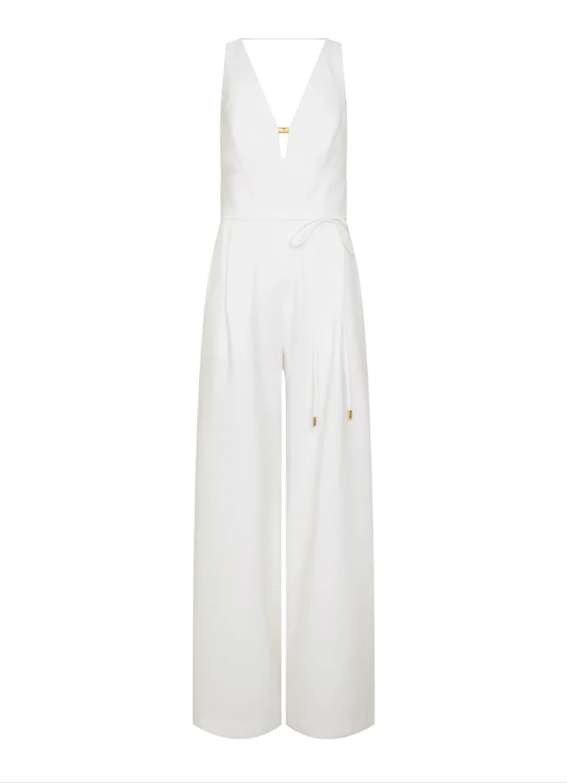 Sofisticado e atemporal, o Macacão Mirella traduz elegância em sua forma mais moderna, perfeito para produções easychic que transitam do almoço sofisticado ao coquetel noturno. Combine com acessórios dourados e sandálias de salto para um visual clean e poderoso. Confeccionado em tecido fluido, o Macacão possui modelagem reta com caimento amplo, decote frontal em “V” profundo com detalhe metálico dourado, cintura marcada com amarração lateral ajustável, costas com decote em “V” acentuado, recorte anatômico no busto, pernas longas de corte amplo e bolsos aplicados na parte posterior, acabamento pespontado e fechamento por zíper invisível lateral.