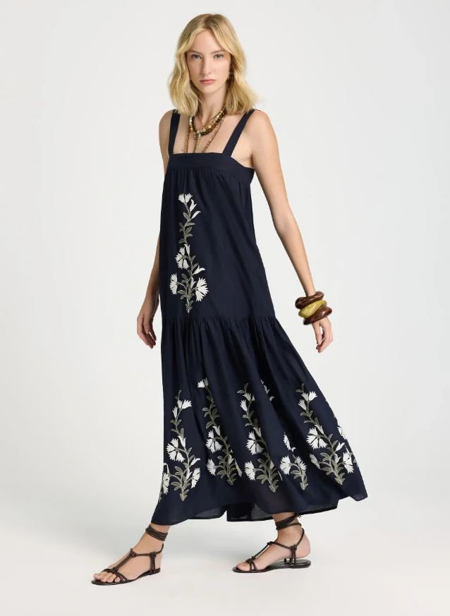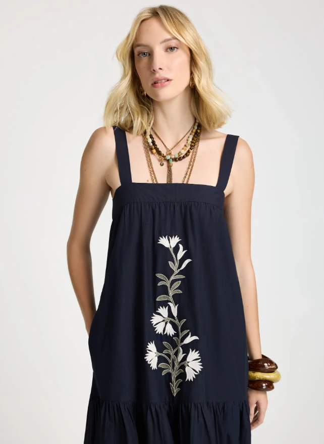 Confeccionado em tecido plano, o Vestido possui modelagem ampla e fluida, decote reto, alças largas estruturadas, bordados florais contrastantes na parte frontal e na barra, recorte na altura do quadril com leve franzido que proporciona movimento, comprimento longo e acabamento pespontado.