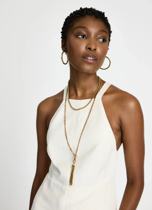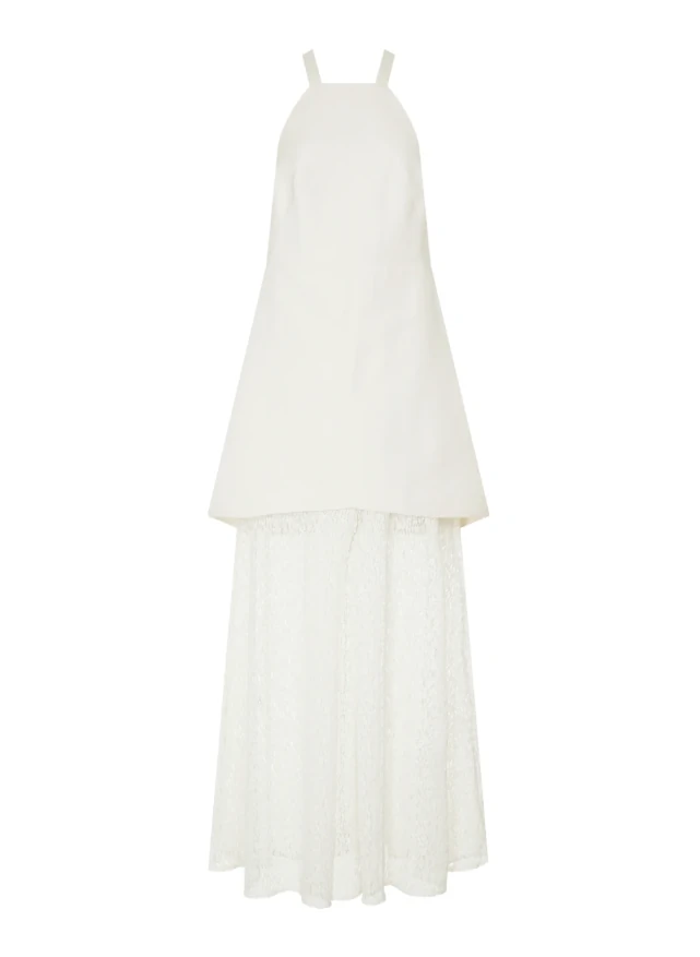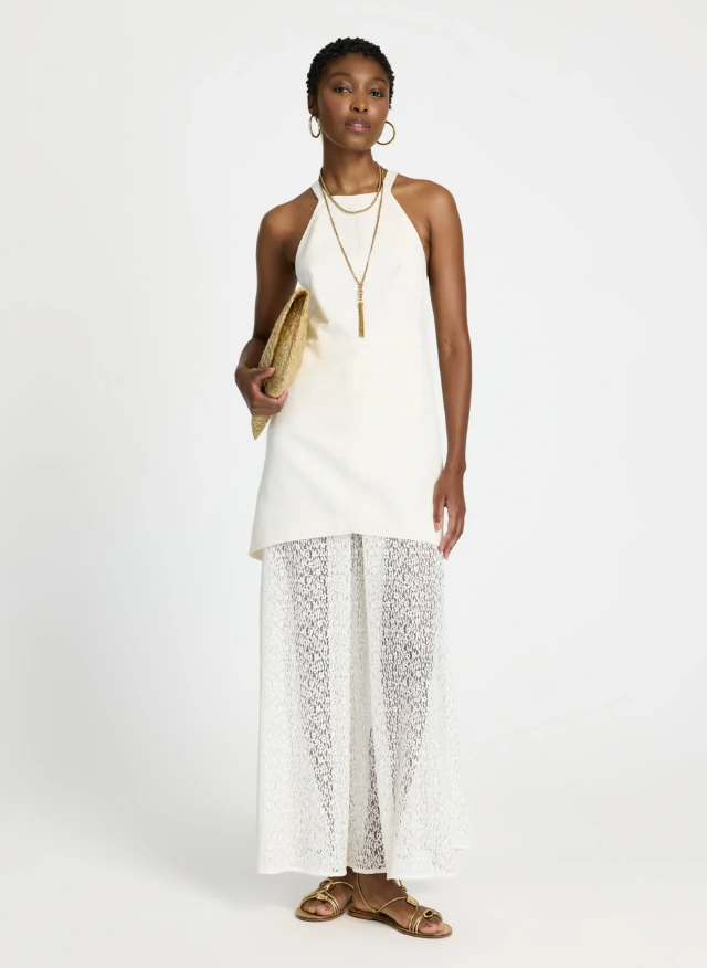 Confeccionado em linho com viscose, o Vestido possui modelagem ampla e fluida, decote reto com alças médias, recorte acinturado que prolonga a silhueta e sobreposição estruturada na parte superior, parte inferior em tecido rendado transparente com leve caimento e comprimento longo, fechamento posterior por zíper invisível e acabamento delicado de barra.