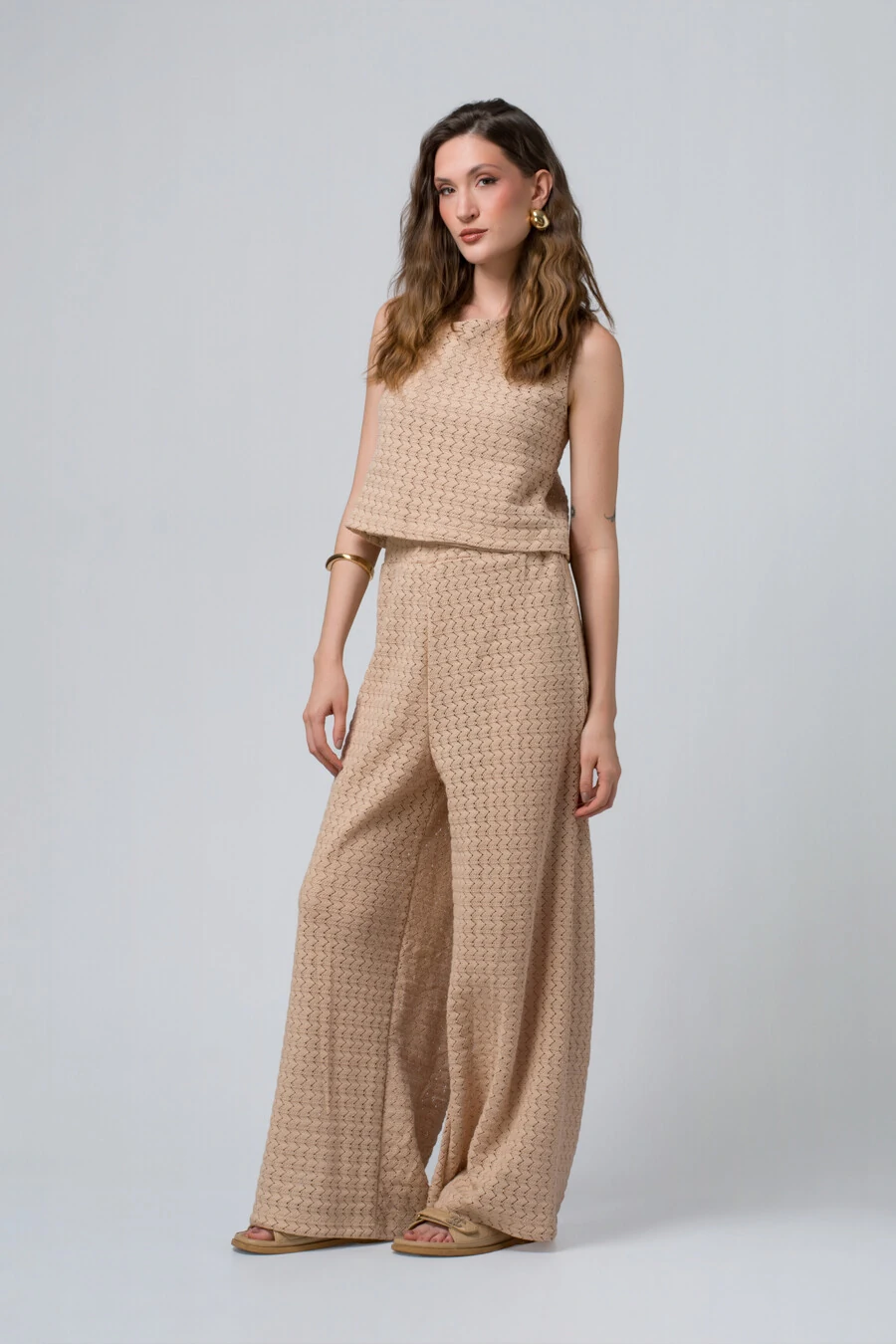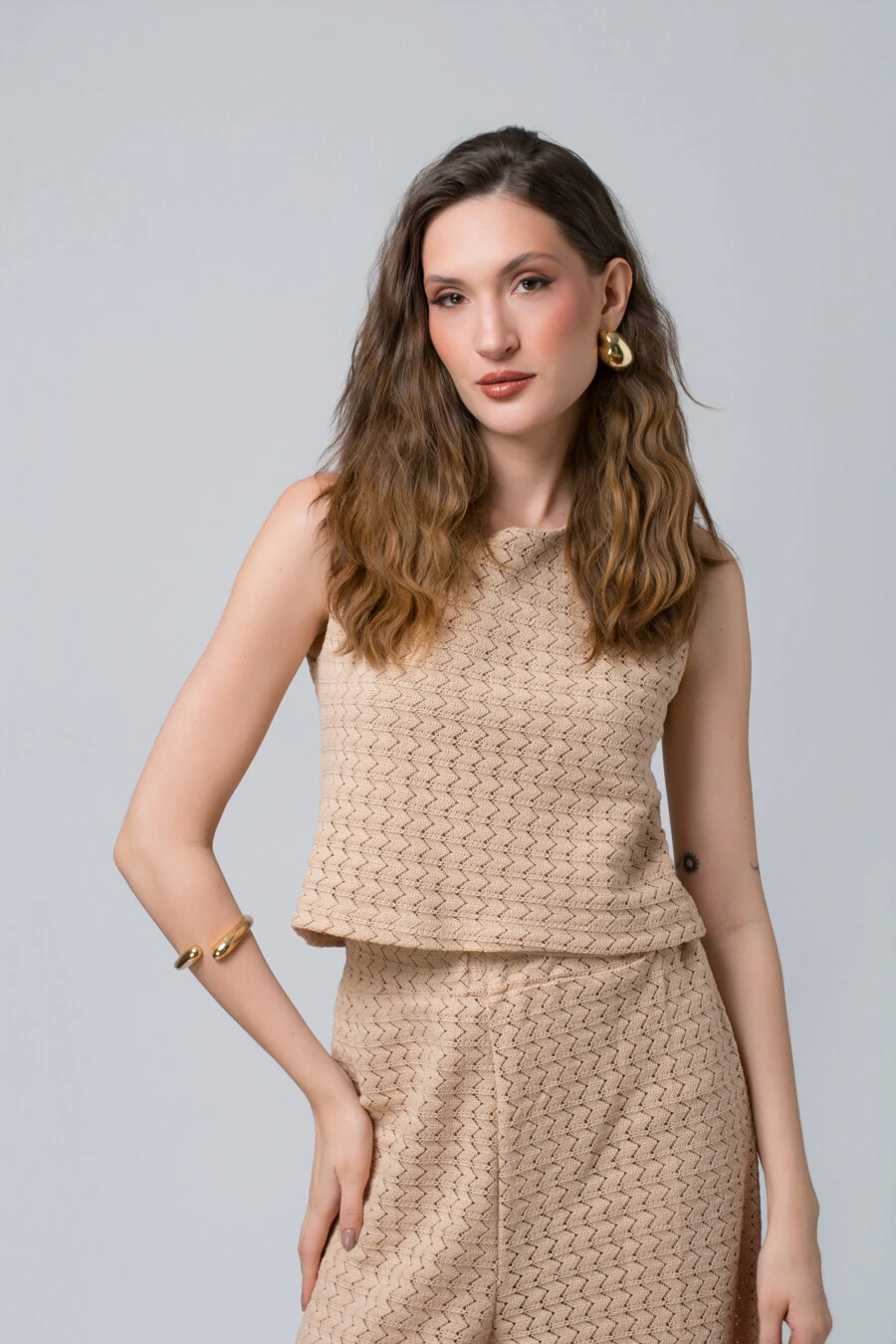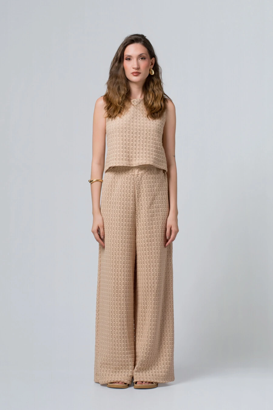 Confeccionado em um tecido texturizado rico em detalhes, o look traz um top cropped reto, que equilibra elegância e frescor, e uma calça pantalona ampla, com hot pant que cria movimento fluido e confere um caimento impecável à silhueta. O tom bege neutro reforça a estética minimalista e atemporal, permitindo combinações versáteis para diferentes ocasiões.