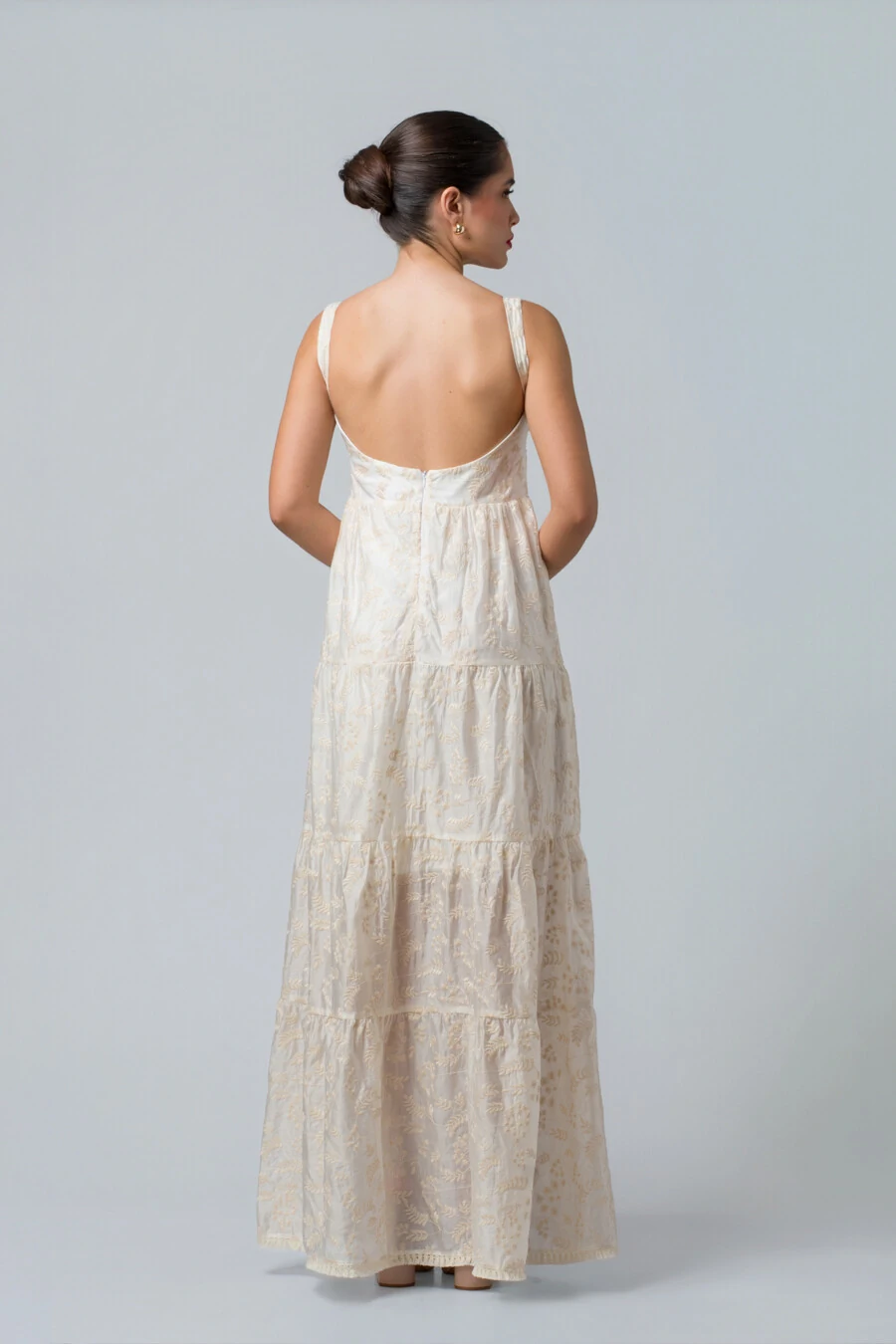 Refinado e encantador, este vestido une romantismo e sofisticação com um toque moderno e leve. O tom mais claro transmite serenidade e frescor, enquanto os bordados florais em tom off-white elevam a peça a um nível de elegância artesanal.