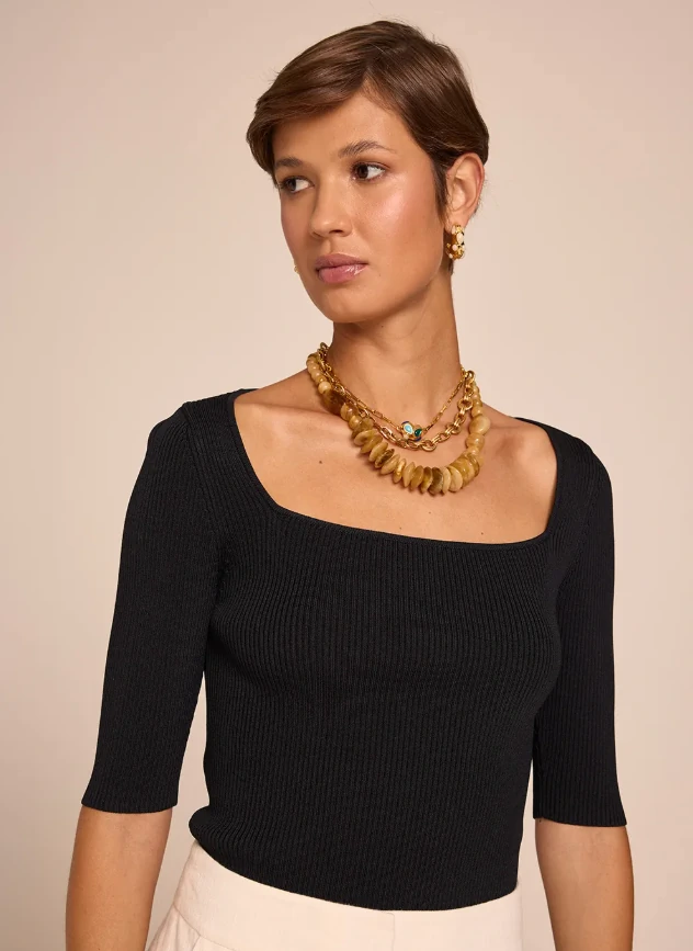 Peça chave para compor uma produção elegante ao mesmo tempo, confortável. Experimente a Blusa Filo com brincos dourados, saia de couro e finalize com bota, para um look moderno e sofisticado.