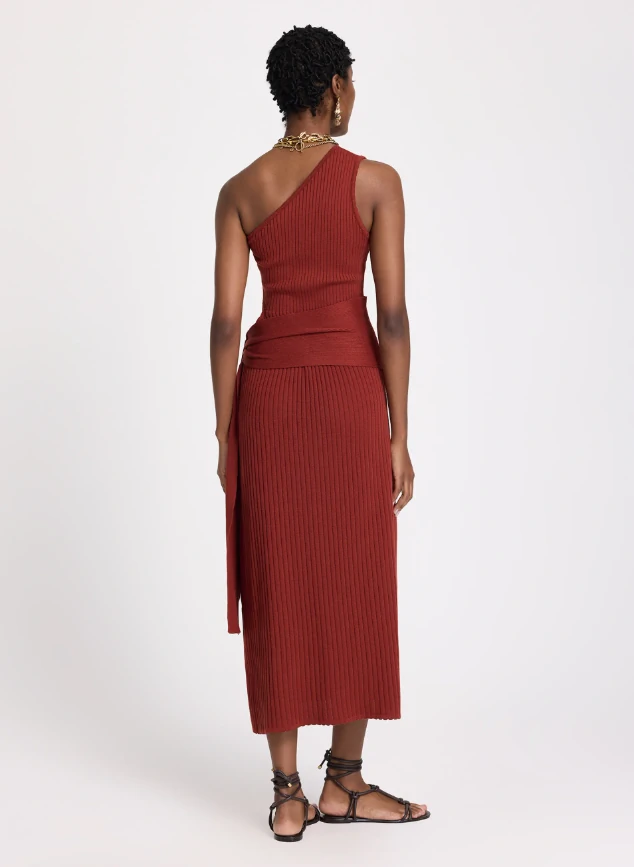 Confeccionado em tricot, o Vestido possui modelagem ajustada ao corpo, comprimento midi, decote assimétrico de um ombro só, cava sem mangas, superfície canelada em toda a extensão, detalhe de recorte lateral na altura da cintura, faixa larga aplicada com amarração lateral e acabamento em barra reta.