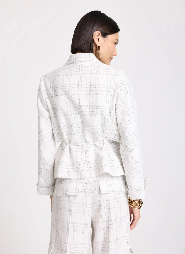 Confeccionado em tecido plano, o Blazer possui modelagem de alfaiataria com caimento estruturado, decote em "V" com lapela clássica, mangas longas com punhos ajustados, estampa padronizada, comprimento curto, fechamento frontal por faixa do próprio tecido com amarração e acabamento refinado nas barras.