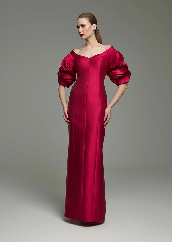 O decote ombro a ombro desenha o colo com delicadeza e sensualidade refinada, enquanto o corpo estruturado acompanha a silhueta de forma precisa, criando um visual alongado e extremamente elegante. O grande destaque fica por conta das mangas em volume escultural, com pregas elaboradas que remetem à alta-costura, trazendo personalidade, impacto visual e um ar contemporâneo ao vestido.