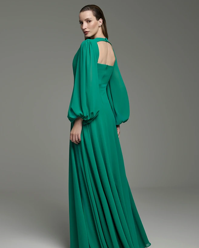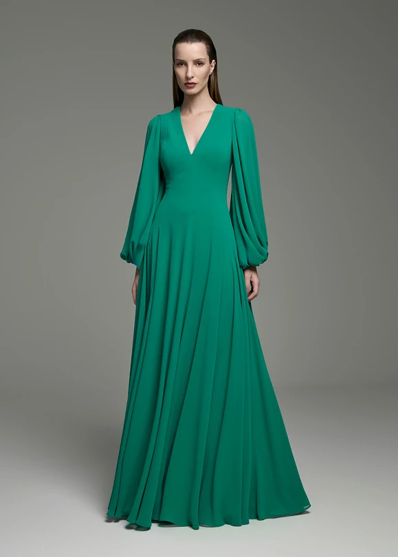 Este vestido longo traduz uma elegância natural e atemporal, com uma estética fluida que valoriza a feminilidade de forma sofisticada. Confeccionado em tecido leve de caimento impecável, apresenta um tom verde intenso e refinado, que transmite frescor, modernidade e presença marcante, ideal para quem deseja se destacar com sutileza.