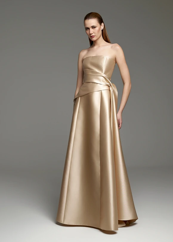 Confeccionado em tecido acetinado de alto brilho, o vestido possui caimento impecável e toque sedoso, refletindo a luz de forma refinada. O busto estruturado valoriza o colo com linhas limpas e precisas, enquanto a cintura é delicadamente marcada por um drapeado assimétrico com laço lateral, que adiciona charme arquitetônico e sofisticação ao design. A saia longa, ampla e fluida, cria movimento majestoso e alonga a silhueta, garantindo um visual imponente e extremamente elegante.