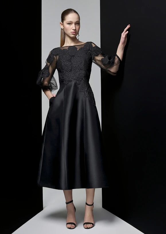 Este vestido é a tradução perfeita da elegância atemporal com um toque contemporâneo de alta-costura. Confeccionado em tom preto profundo, ele combina sofisticação e presença marcante, criando uma silhueta impecável que valoriza o corpo com discrição e refinamento. O comprimento midi traz equilíbrio absoluto entre modernidade e classe, tornando a peça versátil e extremamente elegante.