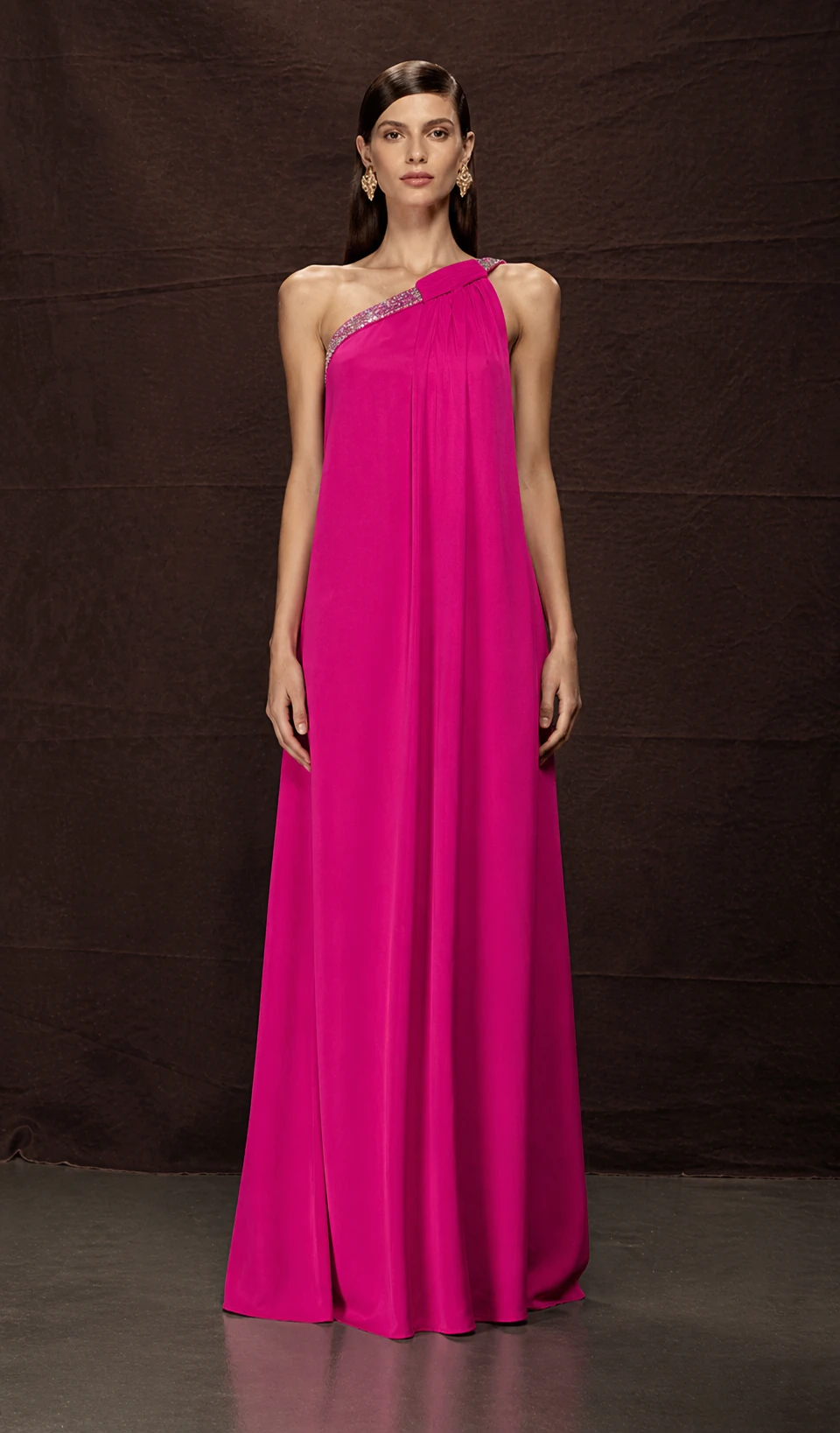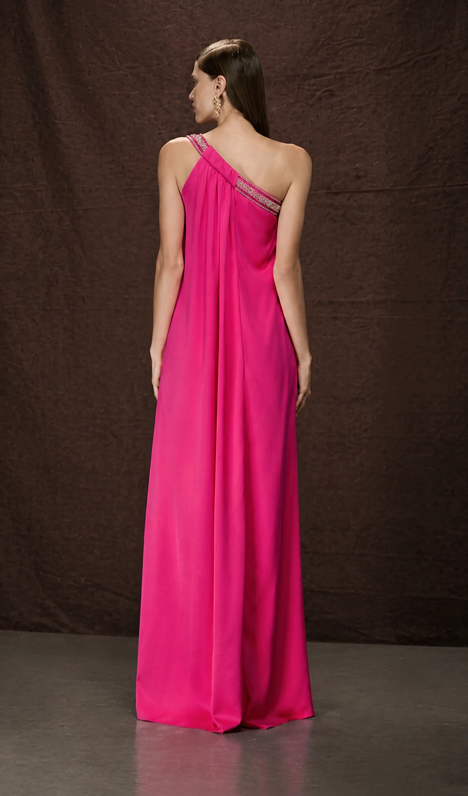 Minimalista, sofisticado e absolutamente marcante — este vestido longo em pink vibrante é a escolha perfeita para quem busca elegância com um toque moderno.