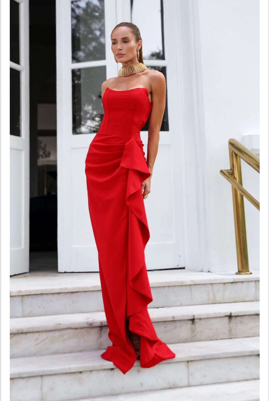 Este vestido longo é a definição de poder, elegância e feminilidade absoluta. Com um design minimalista e extremamente sofisticado, ele valoriza a silhueta com um caimento impecável, criando uma presença marcante e inesquecível. O busto estruturado sem alças realça o colo com sutileza e segurança, enquanto o corte ajustado ao corpo desenha linhas elegantes e sensuais na medida certa.