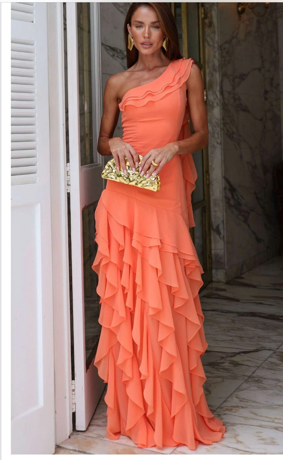 Este vestido longo é a tradução perfeita da elegância contemporânea com um toque de ousadia sofisticada. Confeccionado em tecido fluido e leve, ele envolve o corpo com delicadeza, valorizando a silhueta de forma natural e extremamente feminina. O design de um ombro só cria um visual moderno e refinado, enquanto os babados sutis no decote adicionam movimento e charme na medida certa, elevando a peça a um patamar de luxo absoluto.