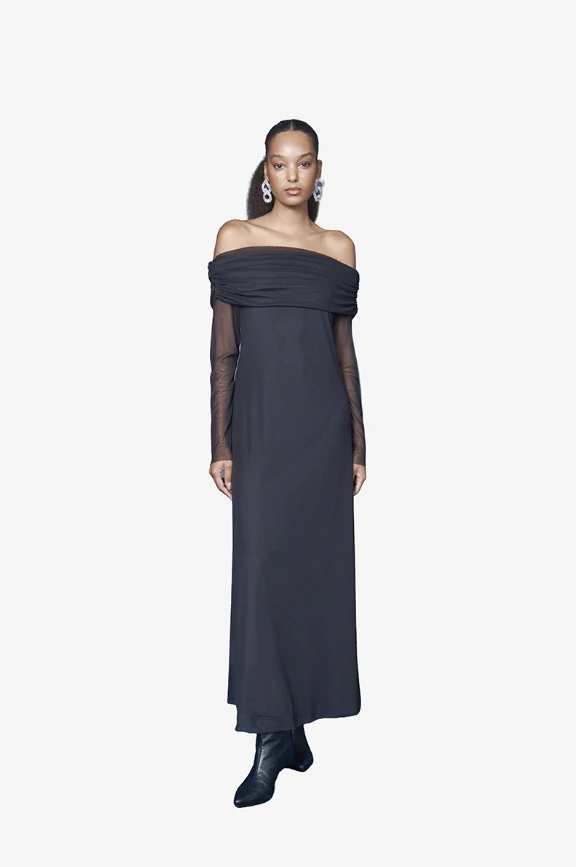 Este vestido longo preto traduz elegância atemporal com uma abordagem contemporânea e sofisticada. Com design ombro a ombro, ele revela a pele de forma sutil e refinada, criando uma silhueta alongada e extremamente feminina. A sobreposição de tecido na parte superior adiciona textura e movimento, enquanto o caimento fluido do corpo do vestido proporciona leveza e sofisticação a cada passo.