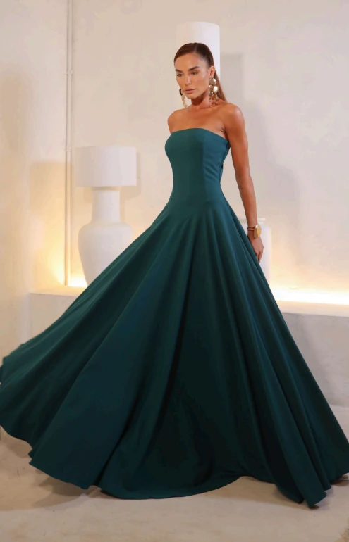 Com um design tomara que caia impecavelmente estruturado, este modelo revela os ombros e o colo com uma elegância atemporal, criando uma silhueta limpa, sofisticada e extremamente feminina. O corte ajustado na parte superior valoriza o busto com firmeza e segurança, enquanto a saia ampla se abre suavemente a partir da cintura, proporcionando movimento fluido e uma presença quase cinematográfica a cada passo.