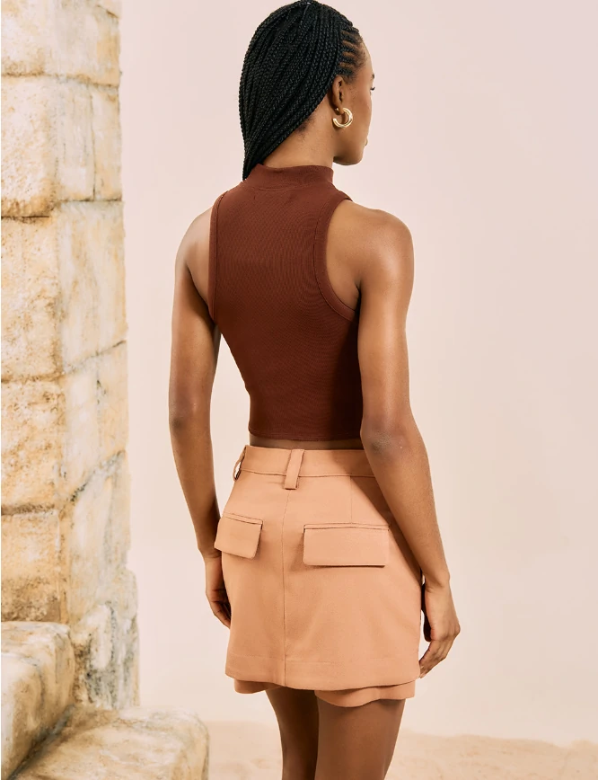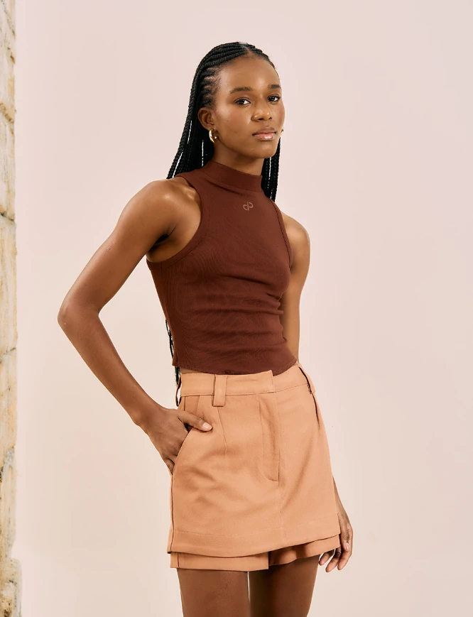 O comprimento levemente encurtado traz modernidade e versatilidade, permitindo combinações com peças de cintura alta, como alfaiataria, saias ou shorts estruturados. A ausência de mangas valoriza os ombros e confere leveza ao look, tornando a peça ideal para dias mais quentes ou sobreposições elegantes.