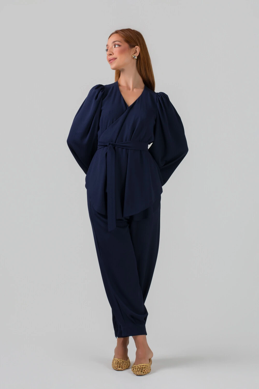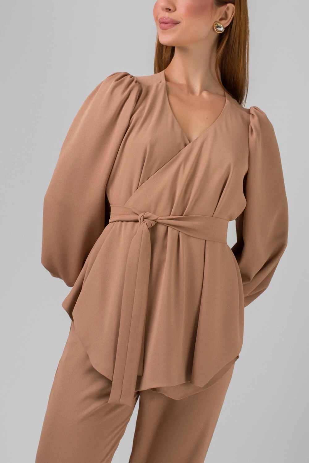 As mangas longas com leve volume nos ombros trazem um toque contemporâneo e refinado à peça, criando um visual equilibrado entre o clássico e o moderno. O caimento fluido do tecido proporciona leveza e movimento, garantindo conforto e sofisticação ao mesmo tempo.