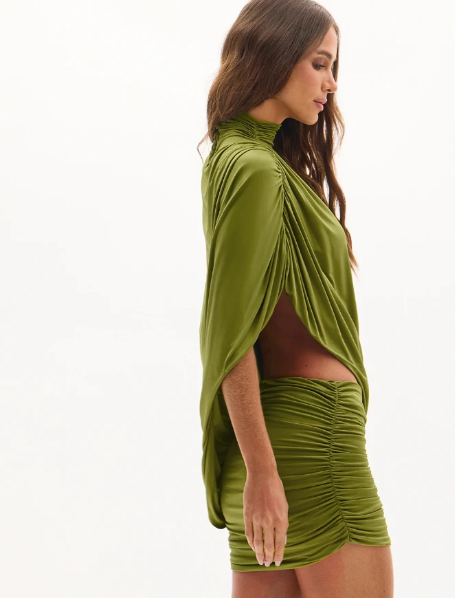 A saia mini ajustada equilibra perfeitamente o volume da parte superior. Com franzidos delicados ao longo do comprimento, ela modela o corpo e realça as curvas de forma elegante, garantindo conforto e um caimento impecável. O trabalho de drapeados cria textura e profundidade, elevando o design do conjunto.