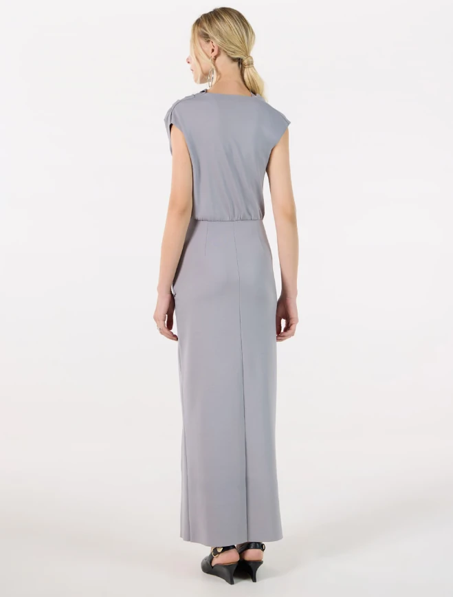 A saia ajustada com drapeados estratégicos desenha o corpo com delicadeza, proporcionando um efeito alongador e extremamente elegante. A fenda frontal adiciona movimento e um toque de sensualidade na medida certa, revelando a pele de forma sofisticada e elevando o impacto visual do look.