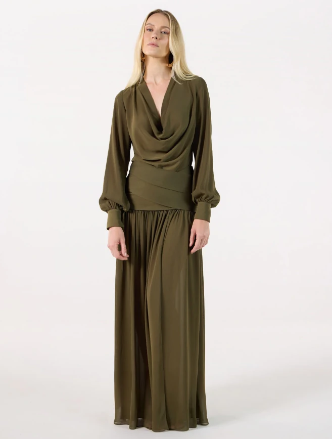 Composto por blusa e saia longa, o look aposta em uma silhueta alongada e extremamente elegante. A blusa apresenta decote drapeado que cai delicadamente sobre o colo, criando um efeito sofisticado e feminino, enquanto as mangas longas com punhos ajustados trazem equilíbrio e um toque clássico à composição.